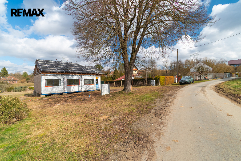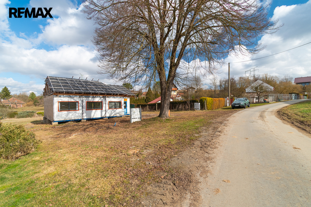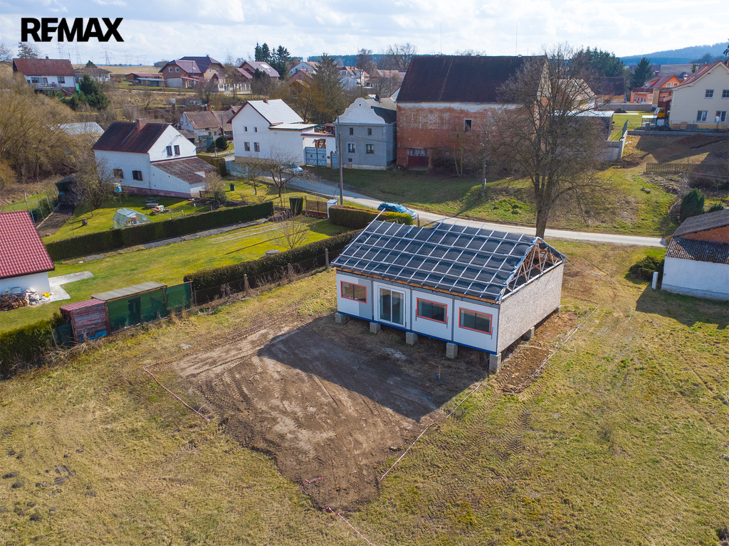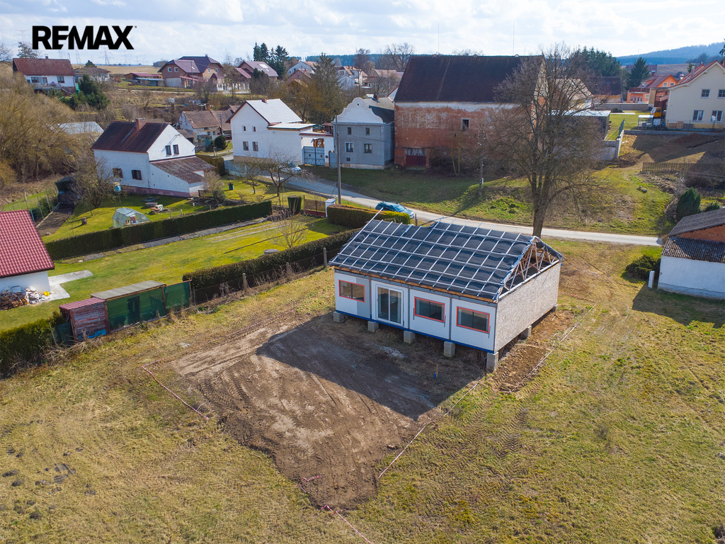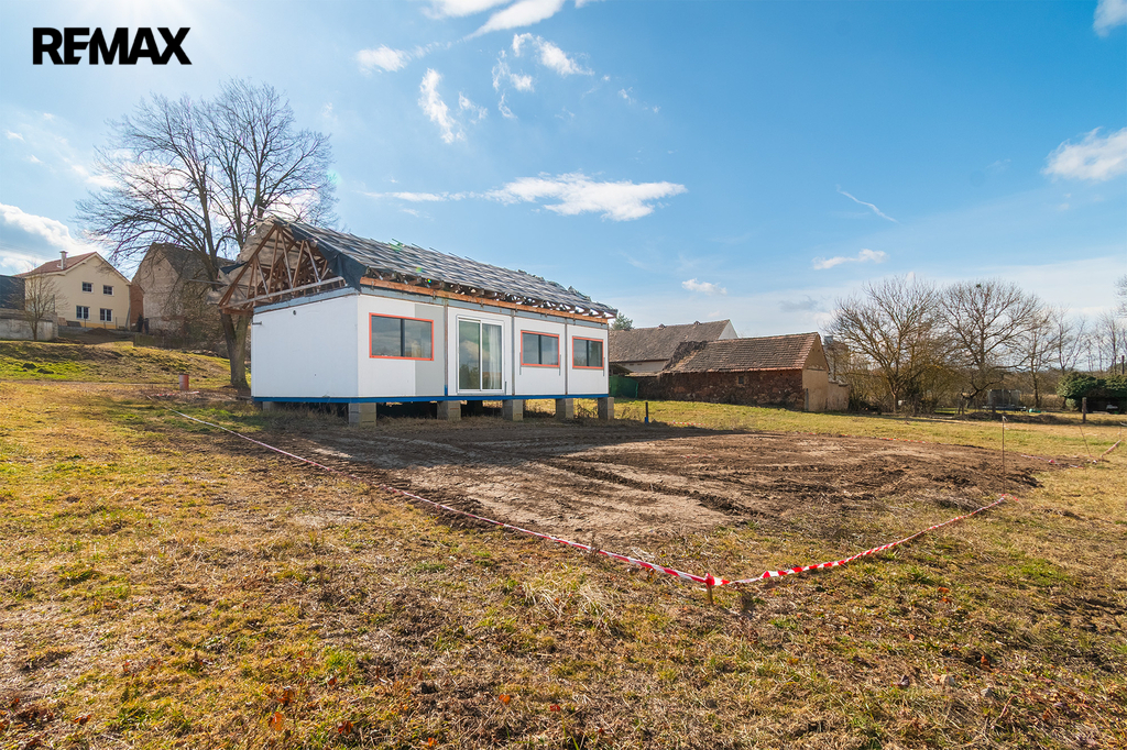 Modulový přízemní rodinný dům 4+kk s orientační užitnou plochou 100 m² je navržen jako samostatně stojící přízemní objekt s modulovou konstrukcí, postavený na betonových patkách. Dispozice zahrnuje obývací pokoj s kuchyňským koutem, ložnici, dva pokoje, koupelnu a závětří. Světlá výška místností je ca. 2,5 metru. Střecha je sedlová s výškou hřebene ca. 5,5 metru a je připravena k dokončení. Fasáda je řešena z pohledových modulových panelů s PIR zateplením o tloušťce 160 mm. Okna a dveře jsou řešeny posuvným systémem a francouzskými dveřmi vedoucími do zahrady. Základy tvoří železobetonové patky o rozměrech 500 × 500 × 800 mm s ocelovým nosným rámem HEB 200 mm. Samonosná ocelová konstrukce domu se sendvičovým zateplením je doplněna vnitřními SDK obklady a příčkami o tloušťce 100 mm. Strop je modulový a střešní konstrukci tvoří dřevěné sbíjené vazníky. Vytápění je zajištěno plynovým kondenzačním kotlem INTERGAS Kombi Kompakt HRE 36/30 A s radiátory. Stavební úřad potvrdil podmínky pro vydání společného souhlasu, ohlášení stavby.