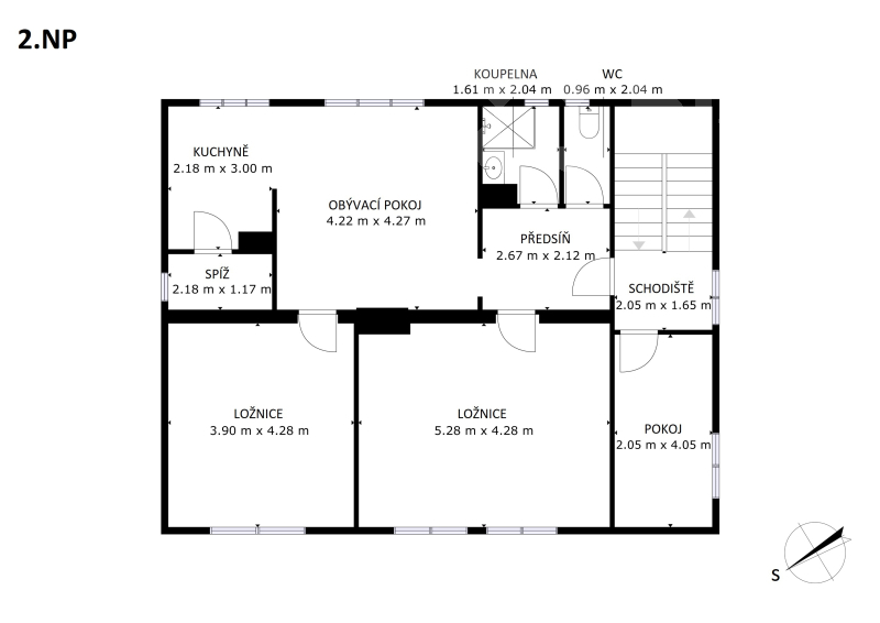 Ve 2.NP se nachází druhý apartmán s přípravou pro kuchyni, prostorným obývacím pokojem, ložnicí a dalšími dvěma pokoji, z nichž jeden může sloužit jako samostatný pokoj pro hosty. Koupelna je stejně jako v přízemí nová, nechybí předsíň ani komora.