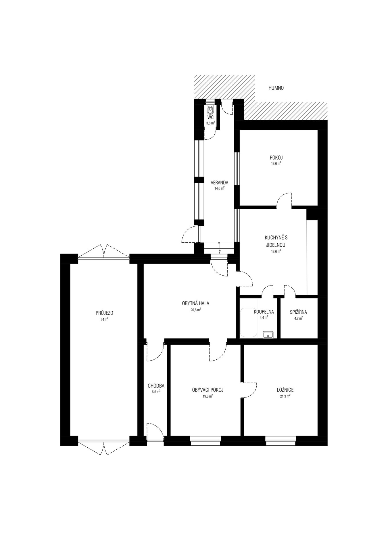 situovány na ulici. Na prosvětlenou verandu je poté situována kuchyň