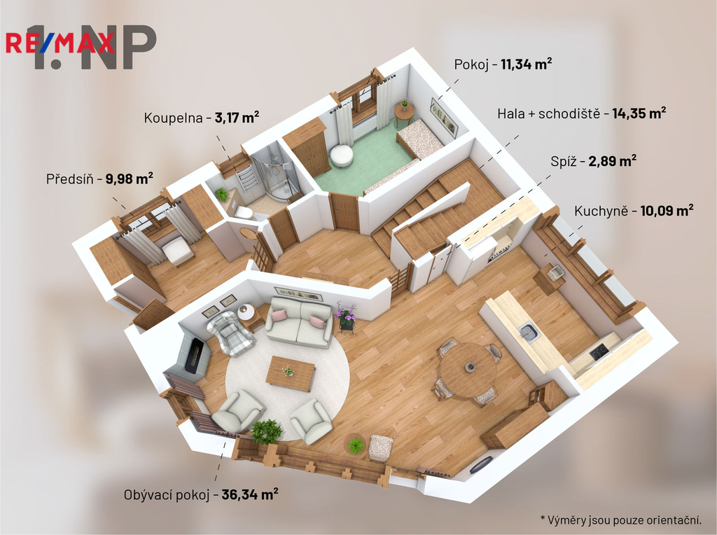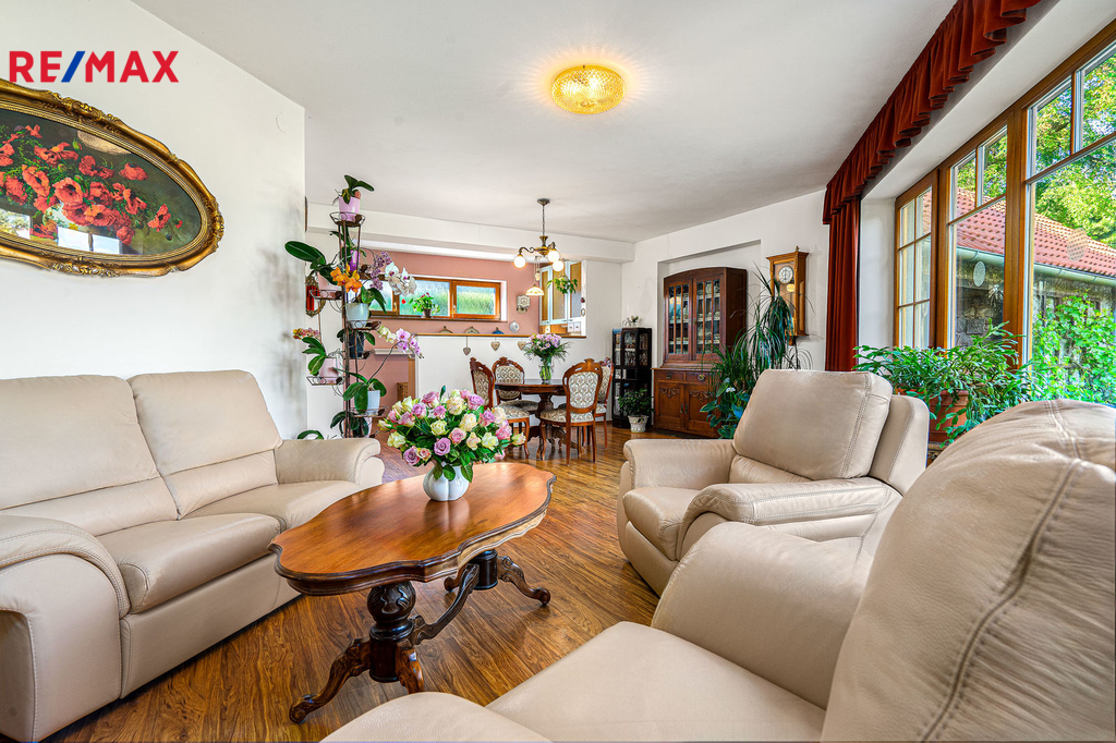 Hlavní místností prostorného rodinného domu je obývací pokoj s kuchyní a s krásnými kachlovými kamny, která zejména v chladných měsících vybízí k příjemného posezení za zvuku praskajícího ohně. Z obývacího pokoje je pak nádherný výhled a přímý vstup do pohádkové zahrady.