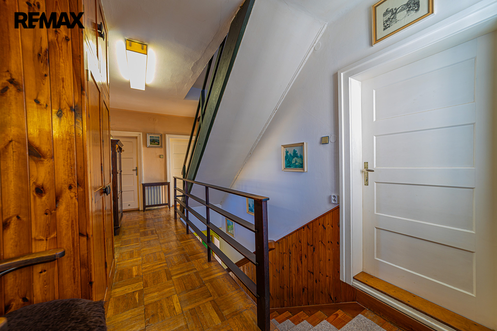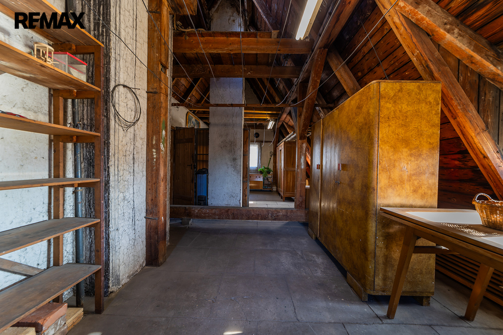 • Střecha: Sedlová s původní břidlicovou krytinou, vysoká půda (cca 5 m) poskytuje dostatek prostoru pro skladování nebo pro stavbu.