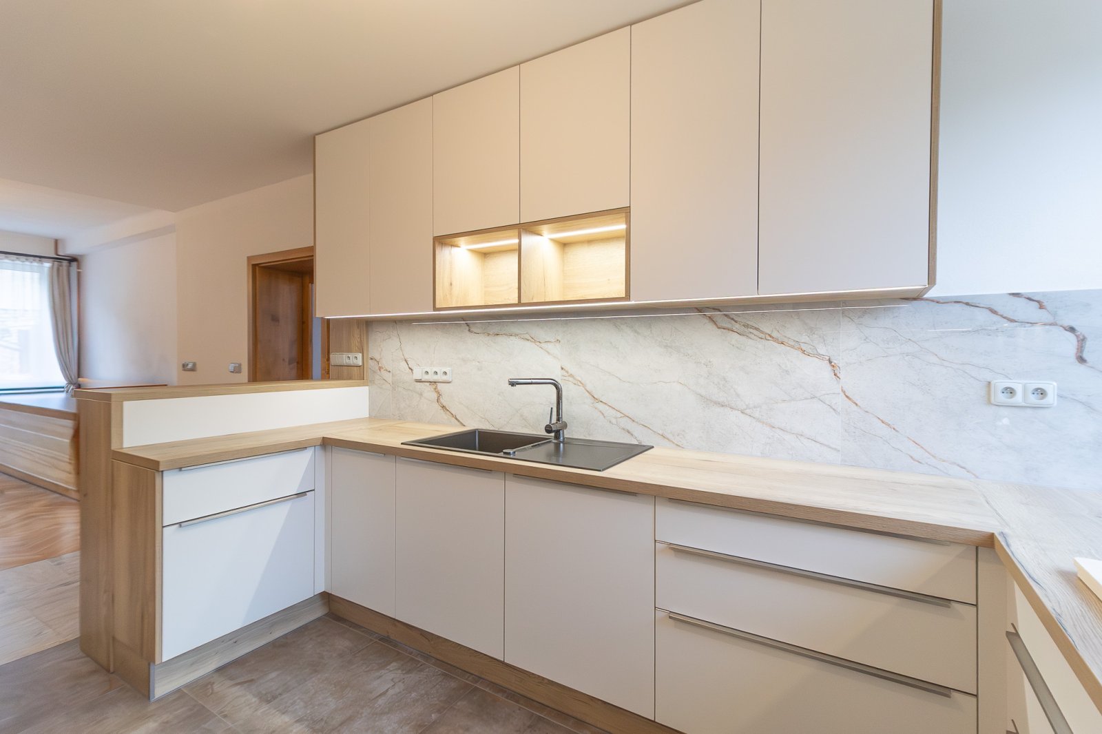 Vnitřní dispozice 1.patro 3+kk nabízí vzdušný obytný prostor s kuchyní s podlahovým vytápěním, přirozeně propojenou s jídelnou a obývacím pokojem, další dva pokoje, koupelna s podlahovým vytápěním a veranda.