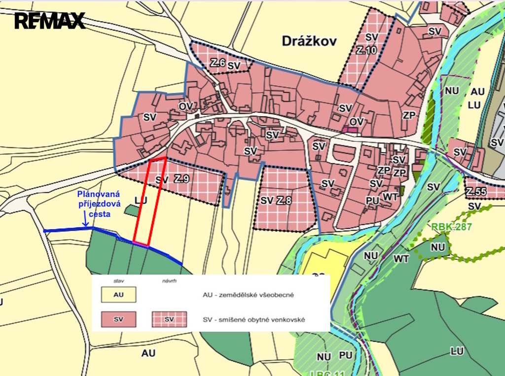 V horní části, podél jižní hranice je plánována nová příjezdová komunikace, která bude sloužit i dalším pozemkům v okolí.