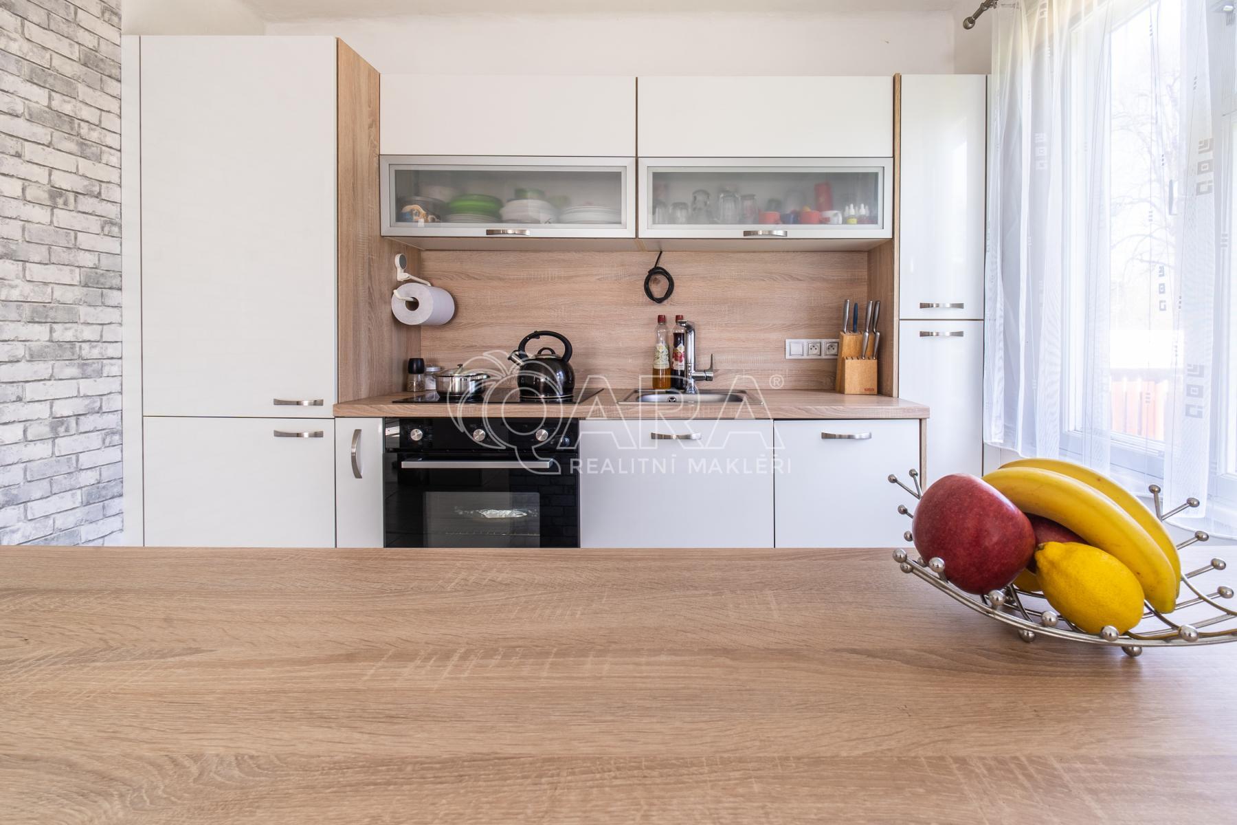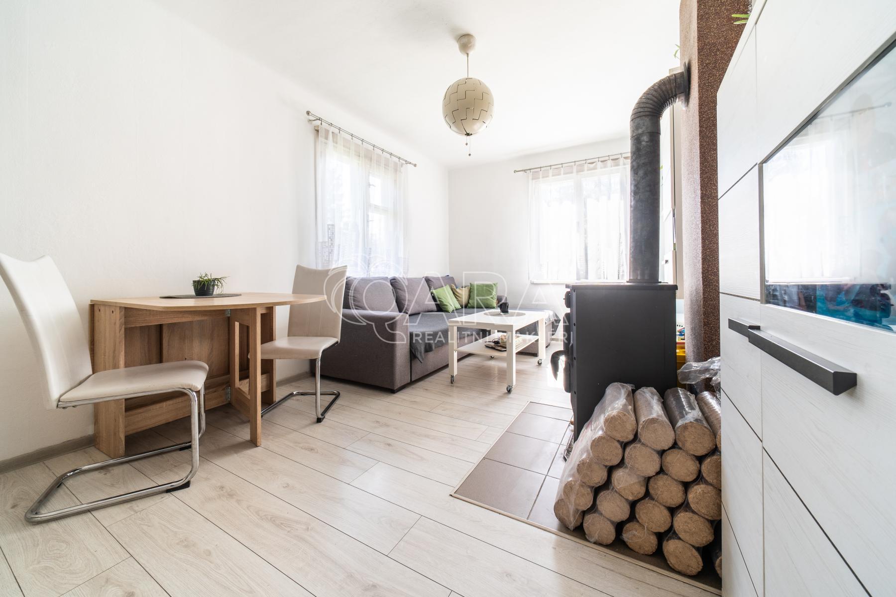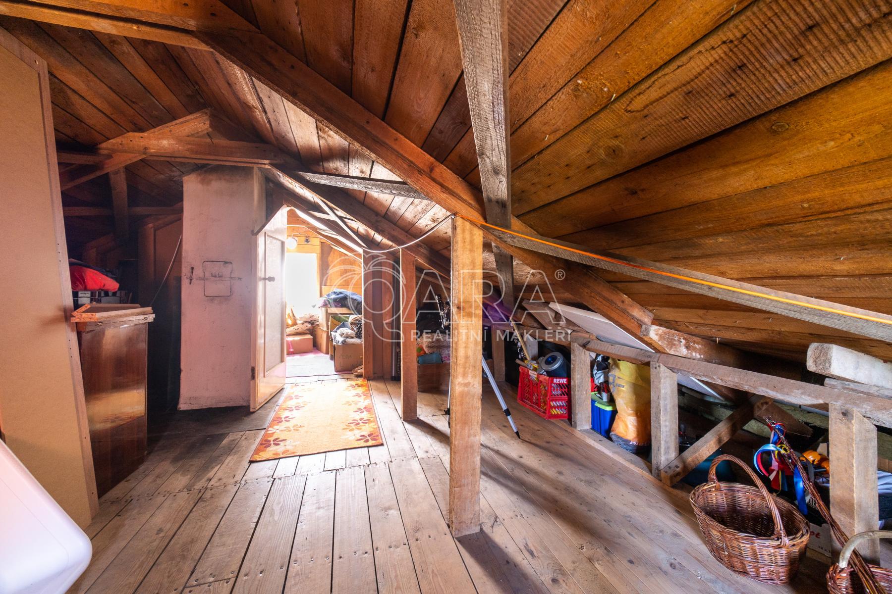 - přízemí - obytné plochy 50 m2 - veranda se vstupní chodbou, jídelna s kuchyní a obývacím pokojem, pokoj, koupelna se sprchovým koutem, samostatné WC, komora, prostorná světlá půda pro skladování, malý sklípek. Dřevěná okna, podlahy keramická dlažba, plovoucí, topení - krbová kamna, odpady kanalizace, voda obecní, studna - užitková, plynová přípojka na hranici pozemku. U domu terasa s posezením.