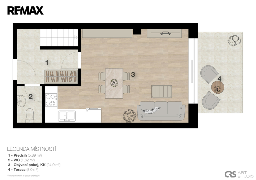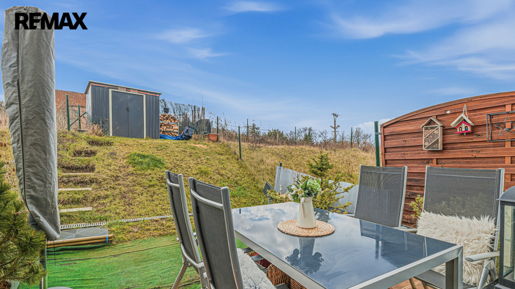 V přízemí domu se nachází předsíň se schodištěm, samostatná toaleta a světlý obývací pokoj s kuchyňským koutem a přímým vstupem na venkovní terasu o velikosti 8 m², na kterou navazuje oplocená zahrada poskytující dostatek soukromí i prostoru pro relaxaci. V patře je chodba se schodištěm, dva samostatné pokoje, koupelna s vanou a toaletou a technická místnost s bojlerem.