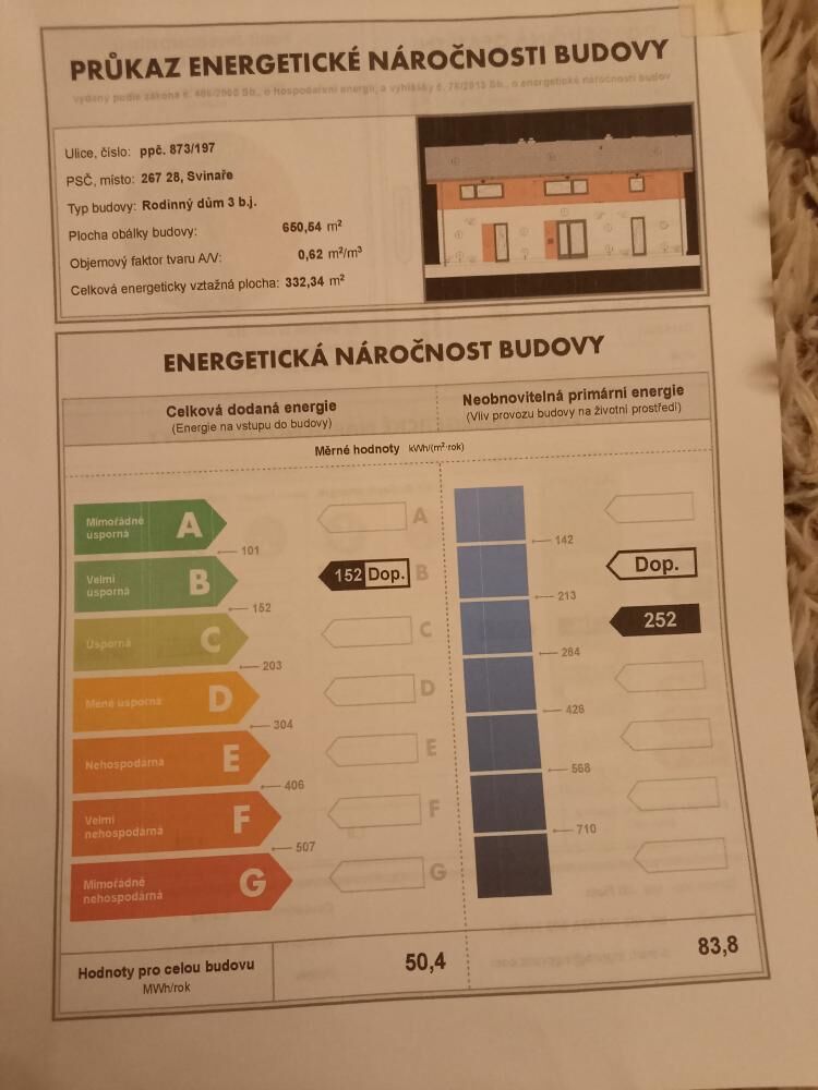 - Ukazatel energetické náročnosti budovy: 152 kWh/m²