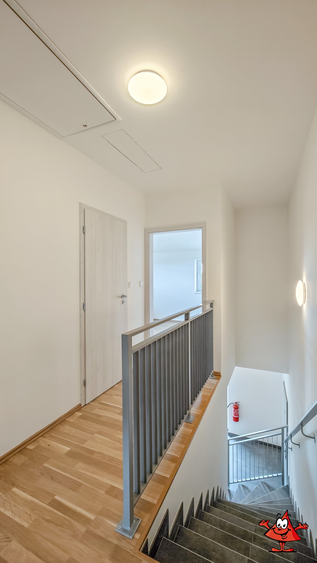 Byt je dvoupodlažní, v menším domě (společně s dalšími dvěma byty) postaveném v nízkoenergetickém standardu. Na obvodové zdivo použity tepelně izolační cihelné bloky Porotoherm, tl. EKO 44 Dry fix, okna plastová, 6 komorový profil s trojsklem. Vytápění je řešeno tepleným čerpadlem vzduch/vzduch a krbovými kamny, energetická třída B = velmi úsporný.