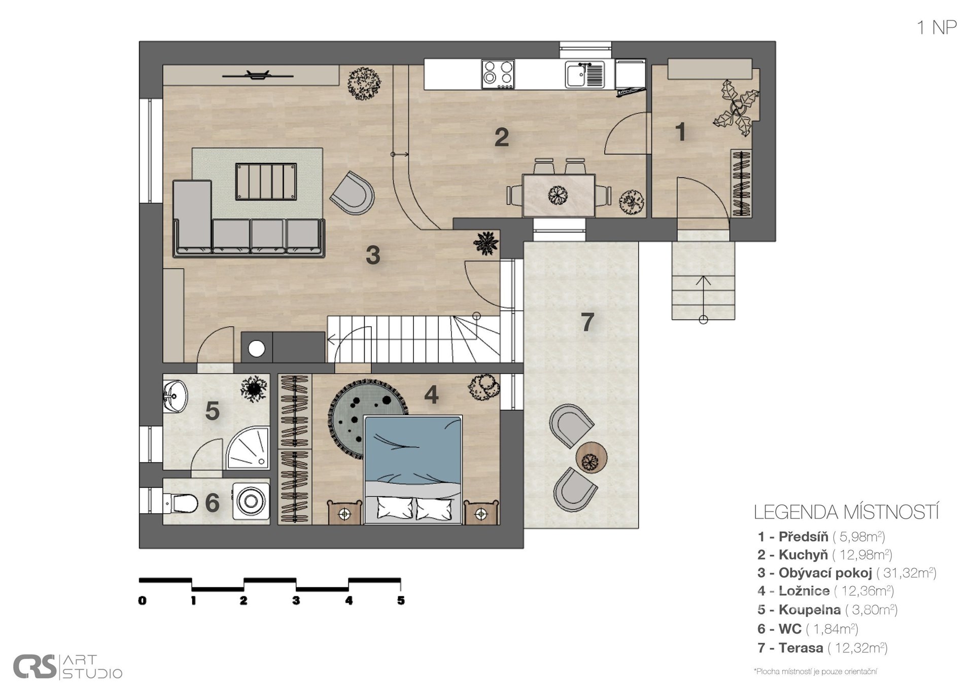 Srdcem domu je otevřený obývací prostor s kuchyní a jídelnou o velikosti 44 m², který působí velmi vzdušně a světlým dojmem. Dominantou místnosti je užívaný krb a z pokoje je přímý vstup na terasu. V přízemí se dále nachází ložnice (13 m²) s vestavěnou skříní, koupelna (4 m²) a samostatné WC.