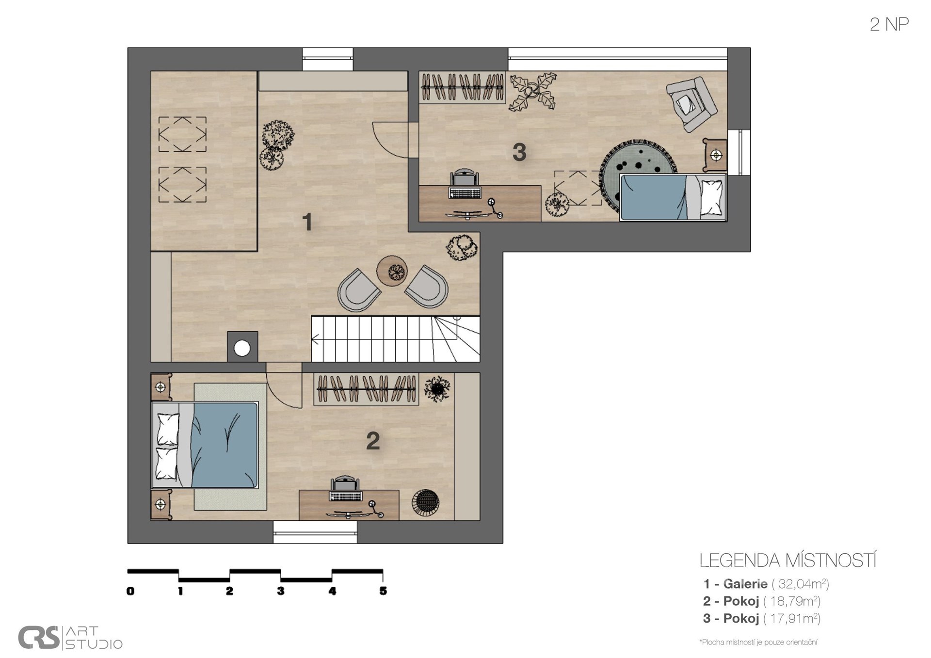 V podkroví jsou dvě prostorné ložnice o velikosti 18 m² a 19 m². Dispozice 4+kk je rozšířena o galerii o velikosti 29 m², která v současnosti slouží jako plnohodnotný obytný prostor (pracovna/relaxační zóna) a významně zvyšuje užitnou hodnotu domu.