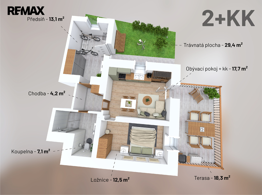 Dispozice tohoto apartmánu 2kk nacházejícího se v přízemí, jeho velká podlahová plocha a dobré členění, nabídne dostatečný komfort pro 4-5 osob. Tento apartmán má svůj vlastní vchod a bezbariérový přístup. Značným benefitem je velmi prostorná terasa pro příjemné posezení nebo grilování. K apartmánu je také ve výhradním užívání menší zahrádka. Za vstupními dveřmi budete mít k dispozici prostornou předsíň, kde můžete pohodlně vyskladnit veškeré své sportovní potřeby, a to klidně i 5 kol, které budete mít plně pod kontrolou.