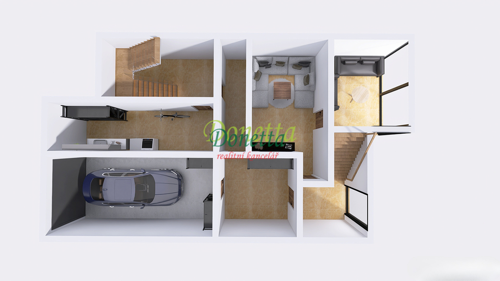 Dispozice sníženého přízemí zahrnují prádelnu se sprchovým koutem a toaletou, kotelnu, sklep, dílnu, pokoj, garáž pro osobní automobil a zimní zahradu s přímým vstupem na terasu a do zahrady. Ve zvýšeném přízemí se nachází vstupní zádveří, schodiště, chodba, prostorný a světlý obývací pokoj (22,31 m²), kuchyně propojená s jídelnou (24,96 m²), prosklená terasa orientovaná do zahrady, pracovna a koupelna vybavená sprchovým koutem, umyvadlem a toaletou. Z kuchyně je umožněn vstup na balkon. V této části domu je také umístěna klimatizace.