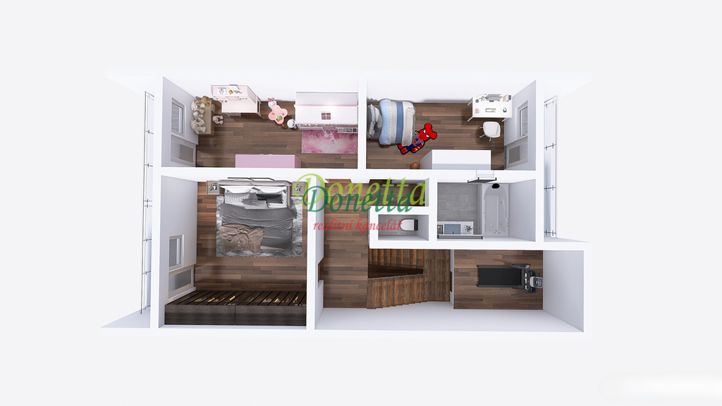 Druhé patro zahrnuje chodbu, samostatnou toaletu, koupelnu s vanou a umyvadlem a tři neprůchozí pokoje (18 m², 16 m² a 11,7 m²). Jeden z nich disponuje samostatným balkonem, zatímco dvě další ložnice sdílejí prostorný balkon (9,38 m²) s výhledem do zahrady. Všechny terasy a balkony jsou zastřešené a umožňují příjemné využití i za nepříznivého počasí. Nad druhým nadzemním podlažím se nachází celý půdorys půdy vhodné k uskladnění věcí nebo případnému vybudování dalších obytných prostor.