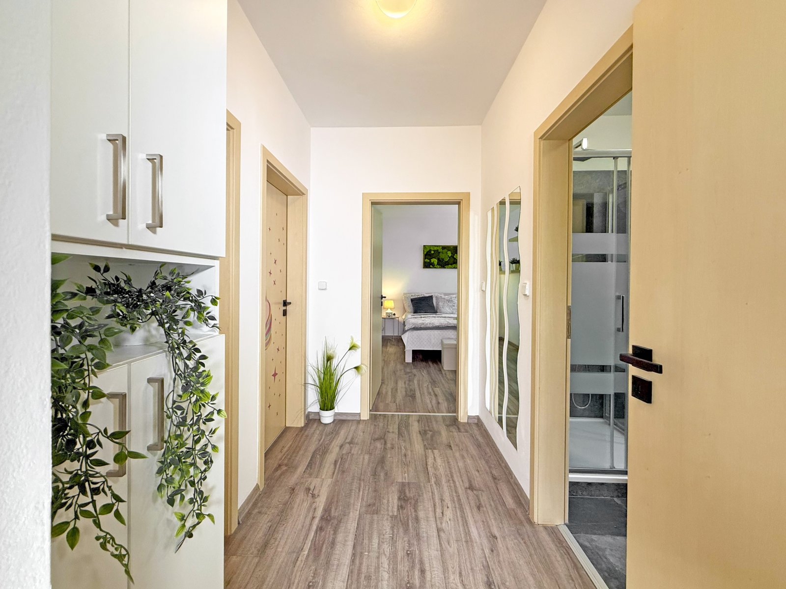 Dominantou bytu je velkorysý obývací pokoj s kuchyňským koutem, komorou a vstupem na zasklenou lodžii s výhledem do zeleně. V obývací části navíc oceníte předokenní rolety, které zvyšují komfort i soukromí. Dále zde najdete ložnici, dětský pokoj a koupelnu s vanou, sprchovým koutem a toaletou. Vstup do bytu vede přes prostornou předsíň, kde je k dispozici druhé samostatné WC. A pokud řešíte úložné prostory, potěší vás 2 prostorné šatny.