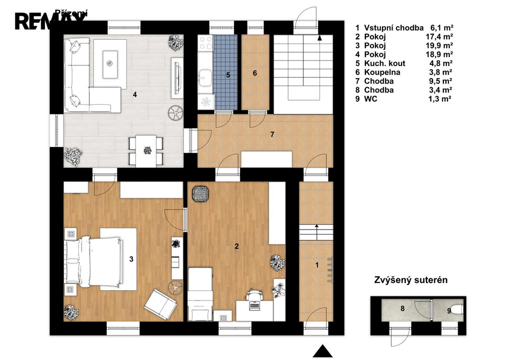 Přízemí: 3 pokoje (17,4 m2, 19,9 m2, 18,9 m2), kuchyňský kout, chodba, komora, vstupní část a schodiště,