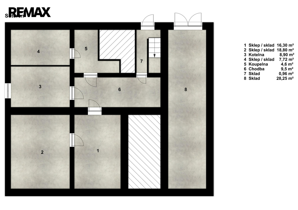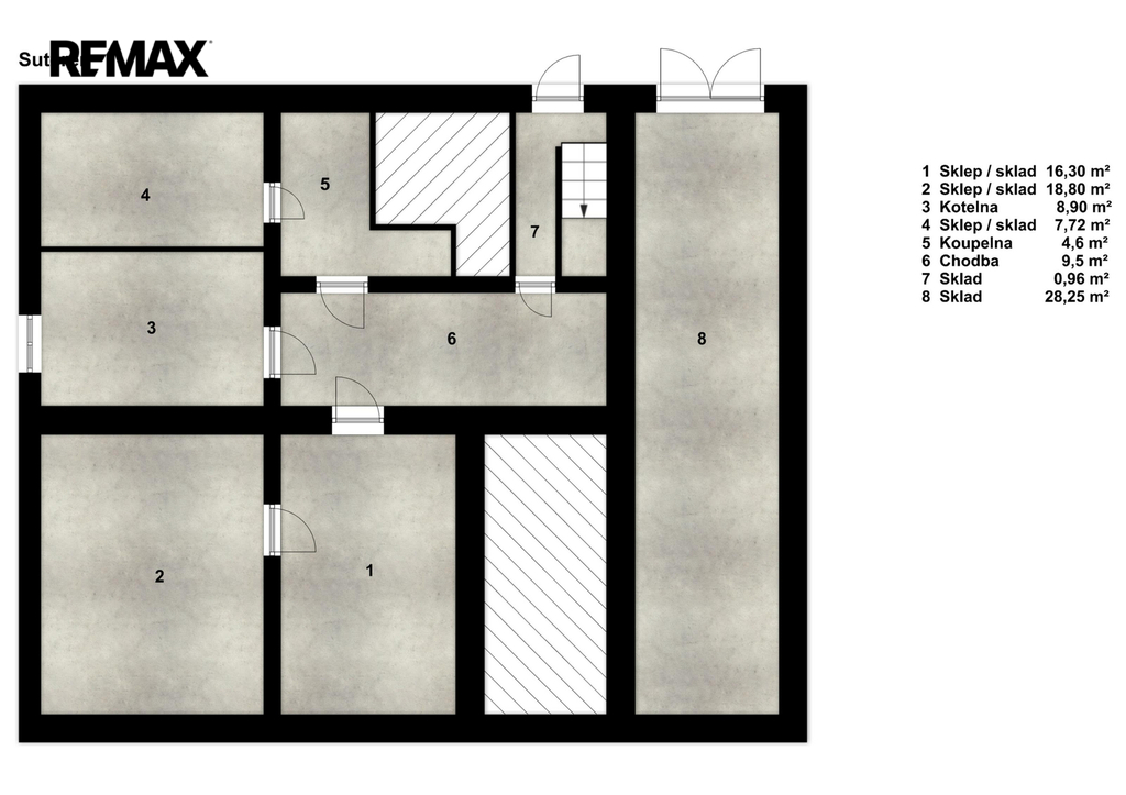 Suterén: kotelna, 3 skladové místnosti, komora a koupelna