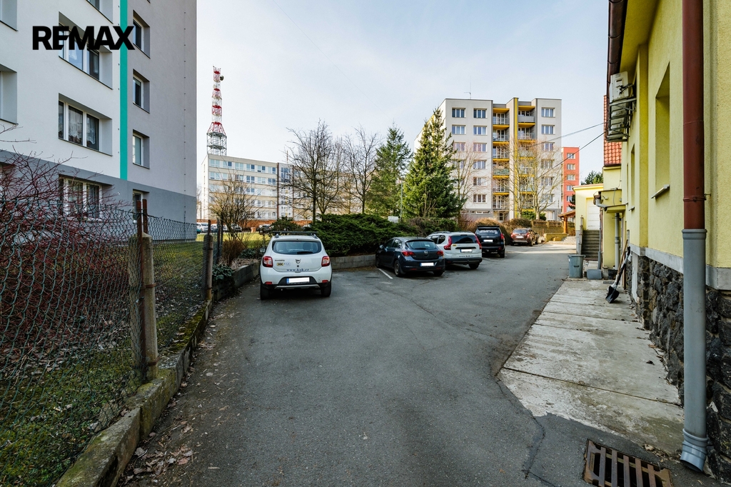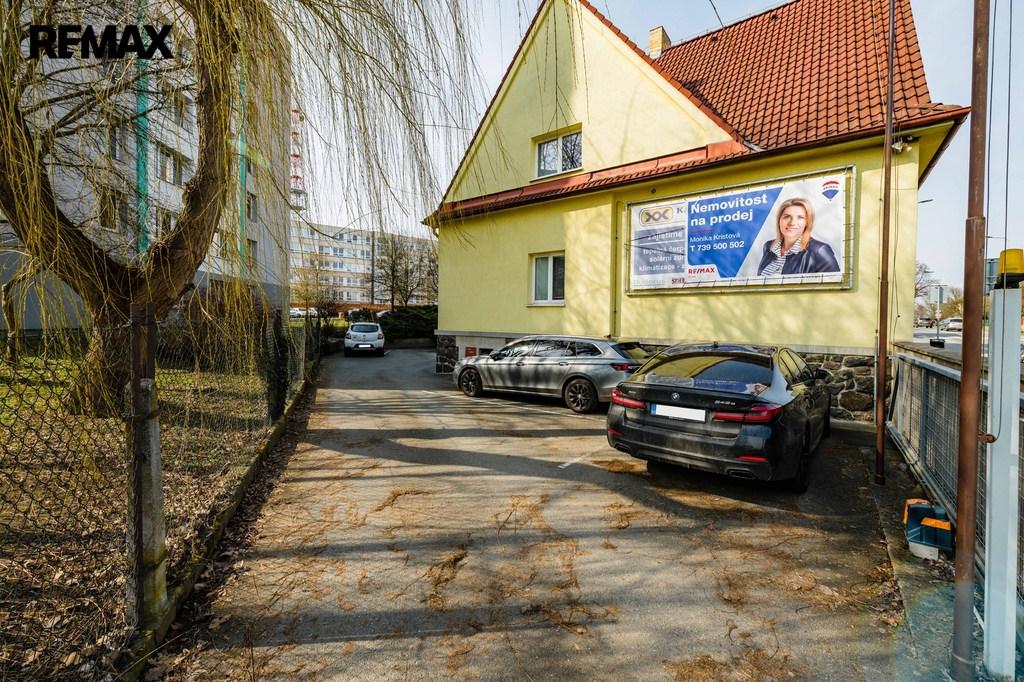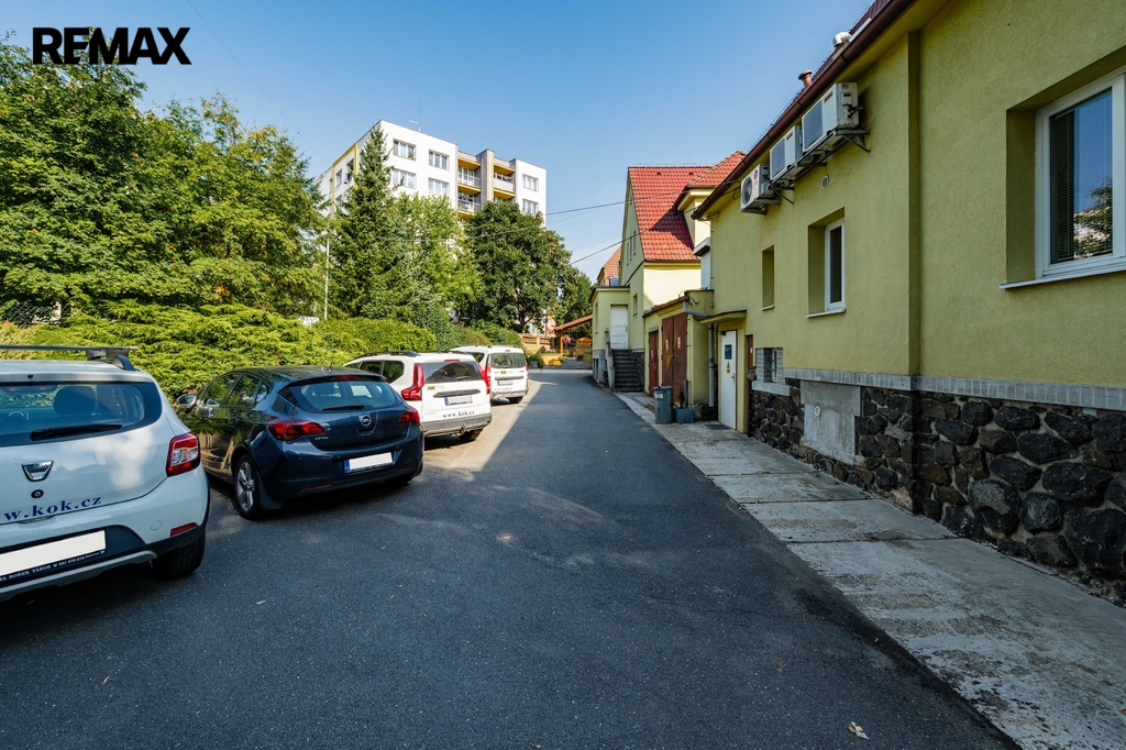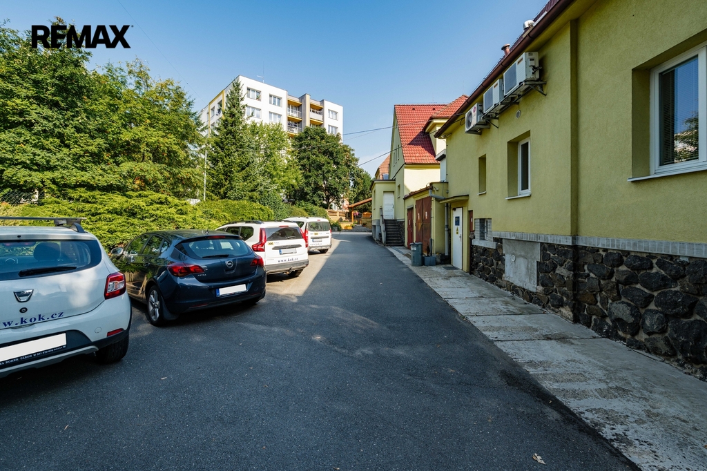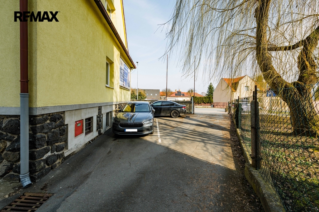 Na pozemku se nachází zpevněná parkovací plocha pro 2–3 automobily přímo u vjezdu. Zadní část pozemku nabízí prostor, který lze změnou využití upravit na příjemnou zahradu, jak naznačuje vizualizace ve fotodokumentaci. Vjezd na pozemek je řešen bránou na elektrický pohon přímo z hlavní komunikace.