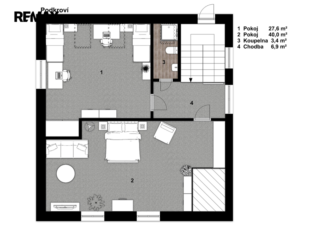 Podkroví: 2 pokoje (27,6 m2, 40 m2), chodba a WC