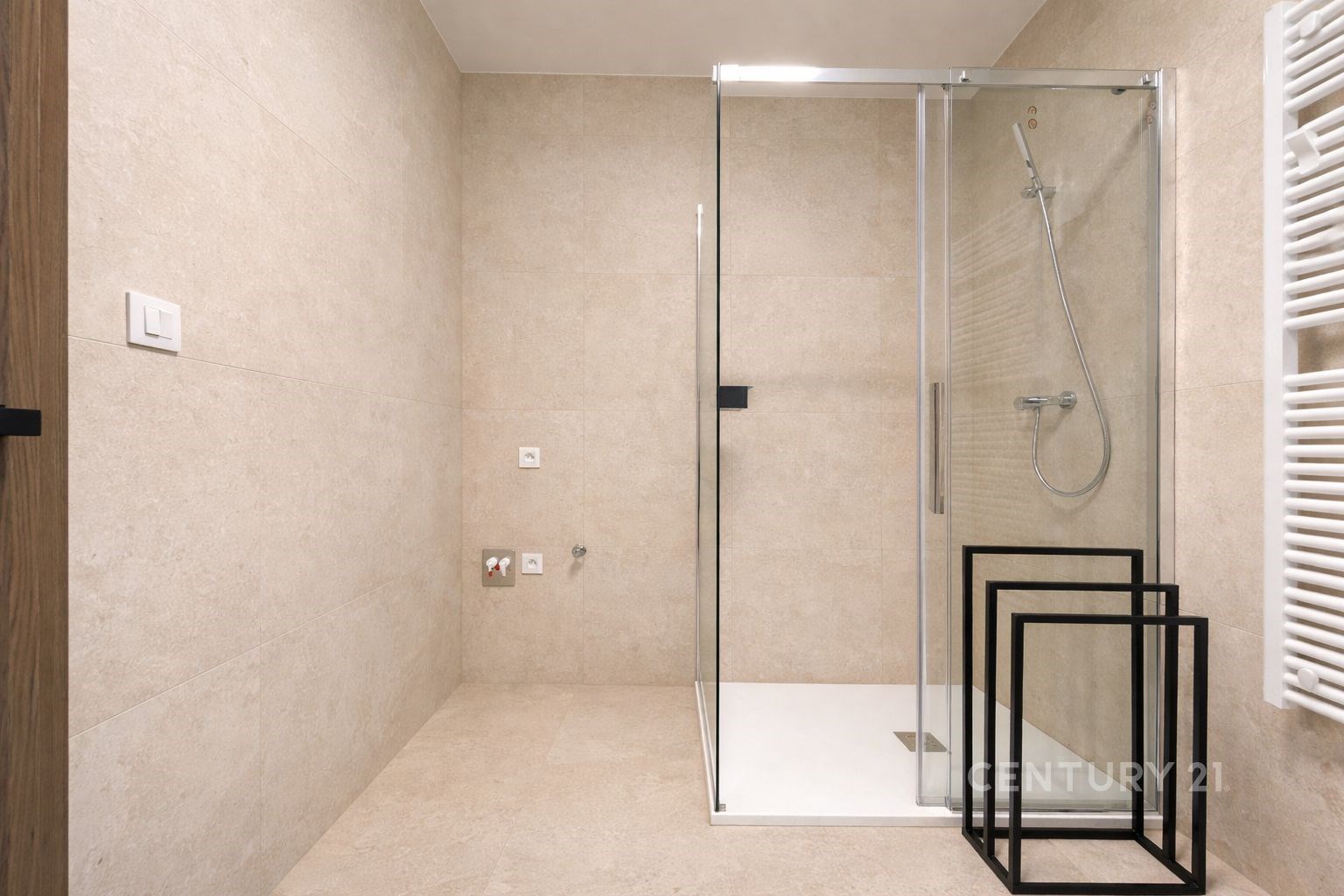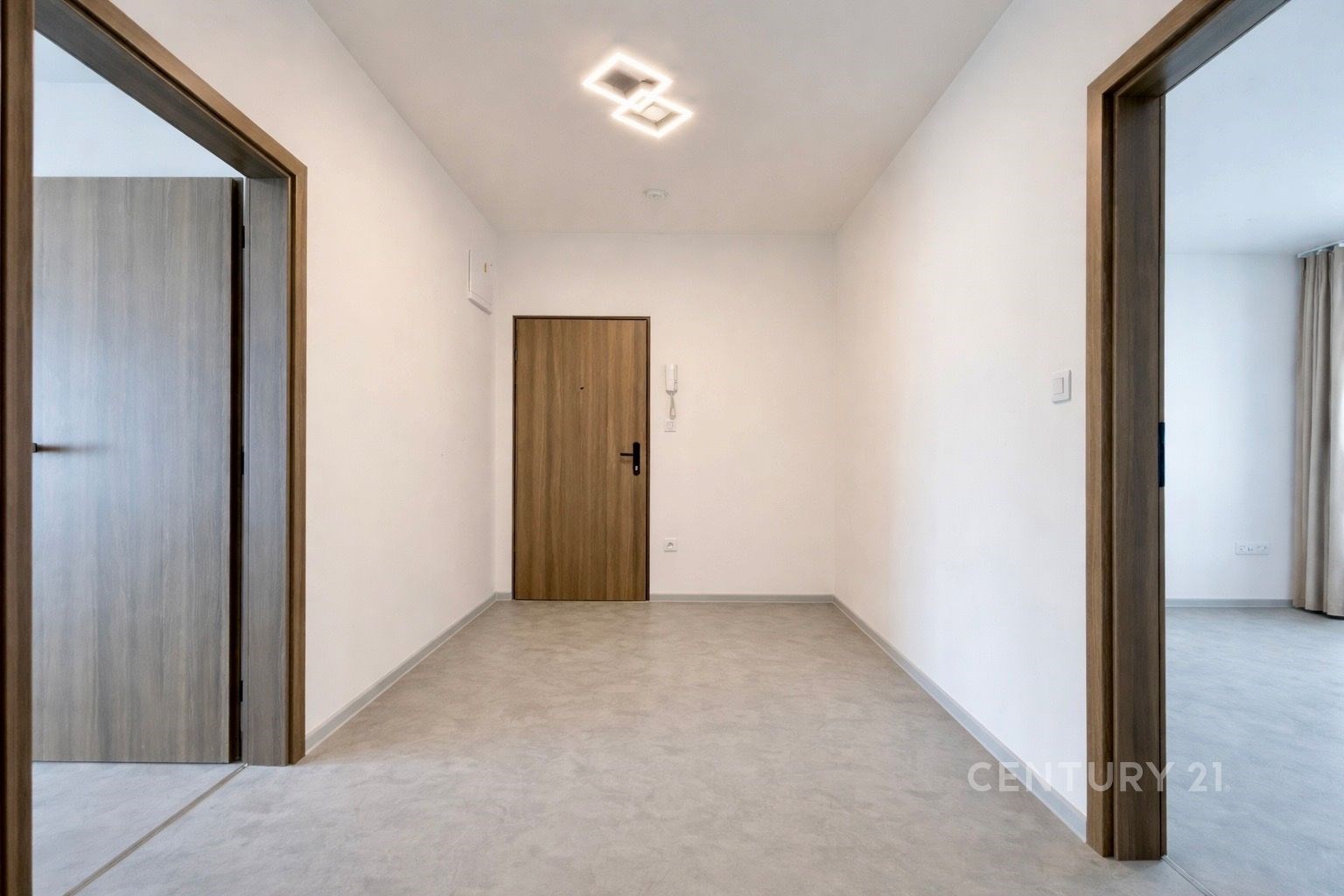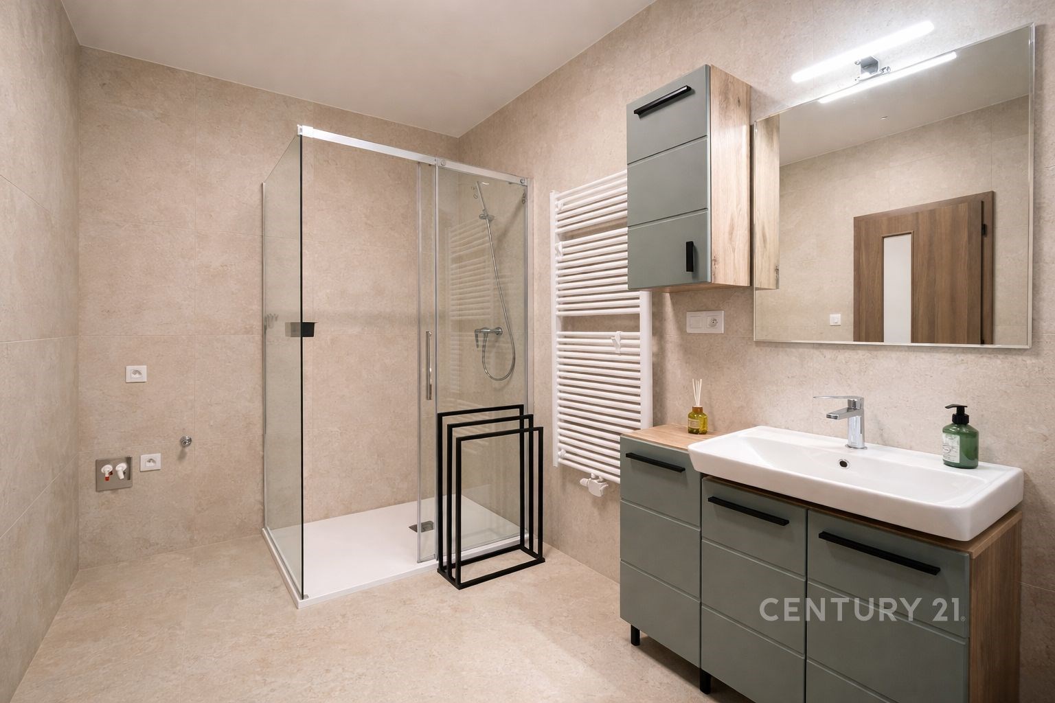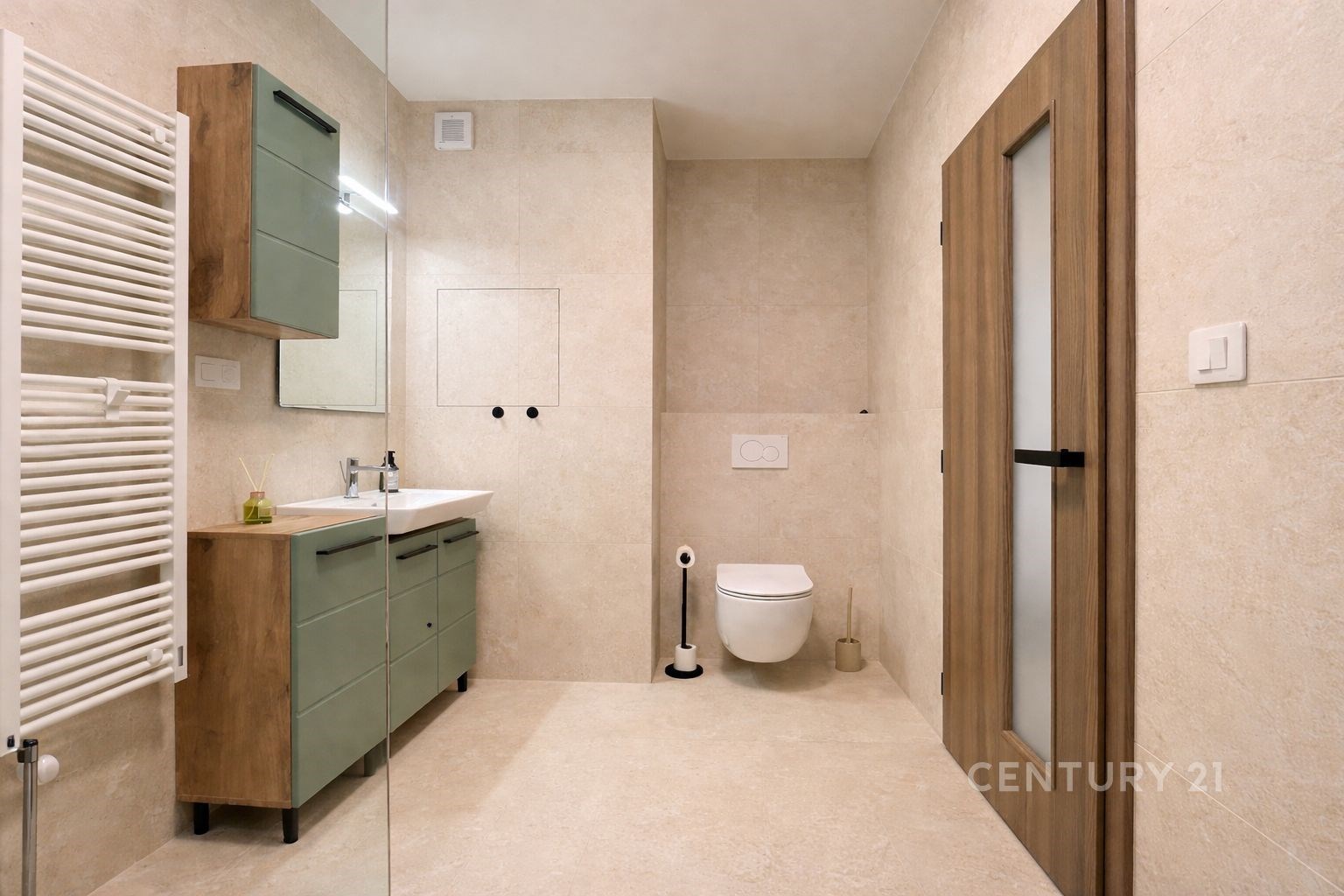 Už při vstupu do bytu vás zaujme prostorná chodba, která podtrhuje celkový vzdušný dojem z bytu – žádné malé ani stísněné prostory, ale příjemné a otevřené bydlení. Koupelna je vybavena sprchovým koutem a toaletou. Samozřejmostí je také připravený prostor pro pračku a sušičku.