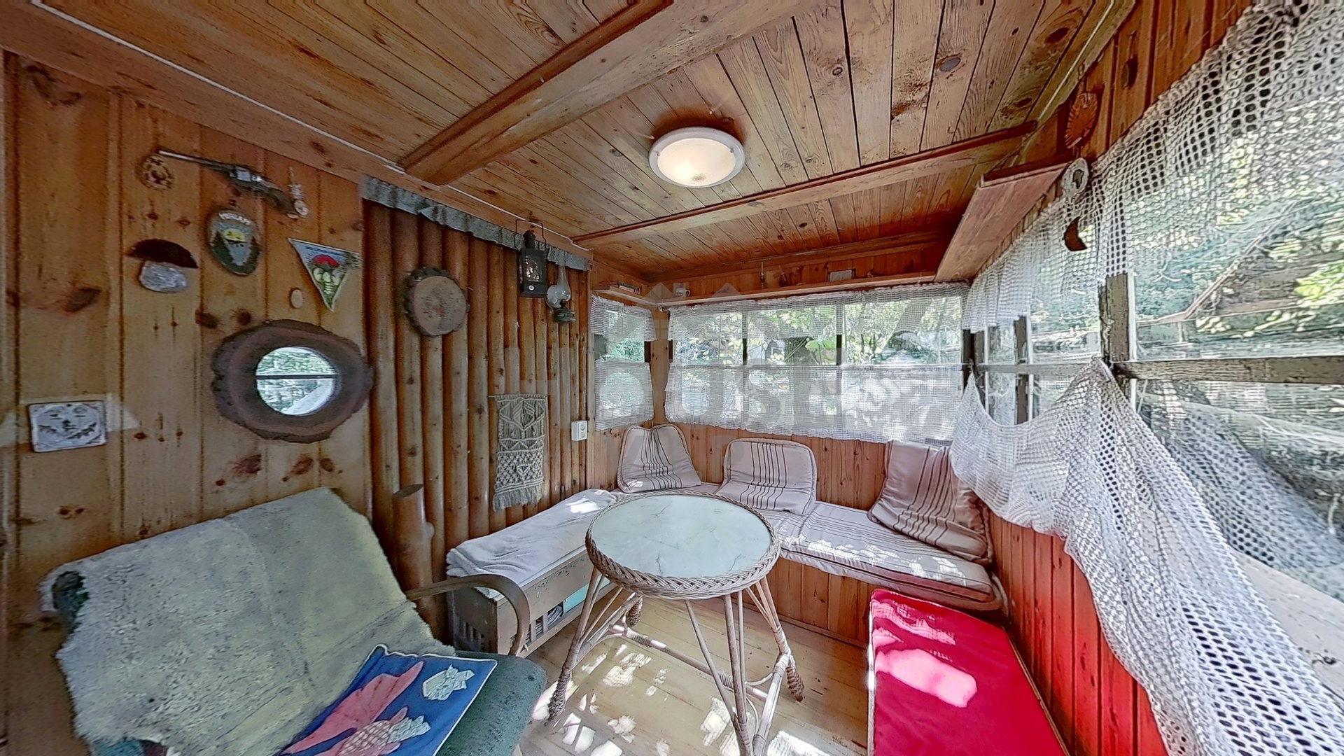 Tuto chatu je možné začít okamžitě využívat k rekreaci, ale zaslouží si alespoň částečnou rekonstrukci. Má slunnou prosklenou verandu, u které je spižírna a vchází se z ní do hlavní obytné místnosti s kamny a schodištěm do podkroví, kde se pohodlně vyspí až 5 osob. V zadní části chaty je kuchyňka s lednicí, s rohovou kuchyňskou linkou s dřezem a s umyvadlem. Z kuchyňky je vstup do "přírodní koupelny" se sprchovým koutem a bojlerem, které které byly dříve připojeny ke společné studni. Chata je napojena na elektřinu (230 V) a disponuje rozvody vody, které byly dříve připojeny ke společné studni.