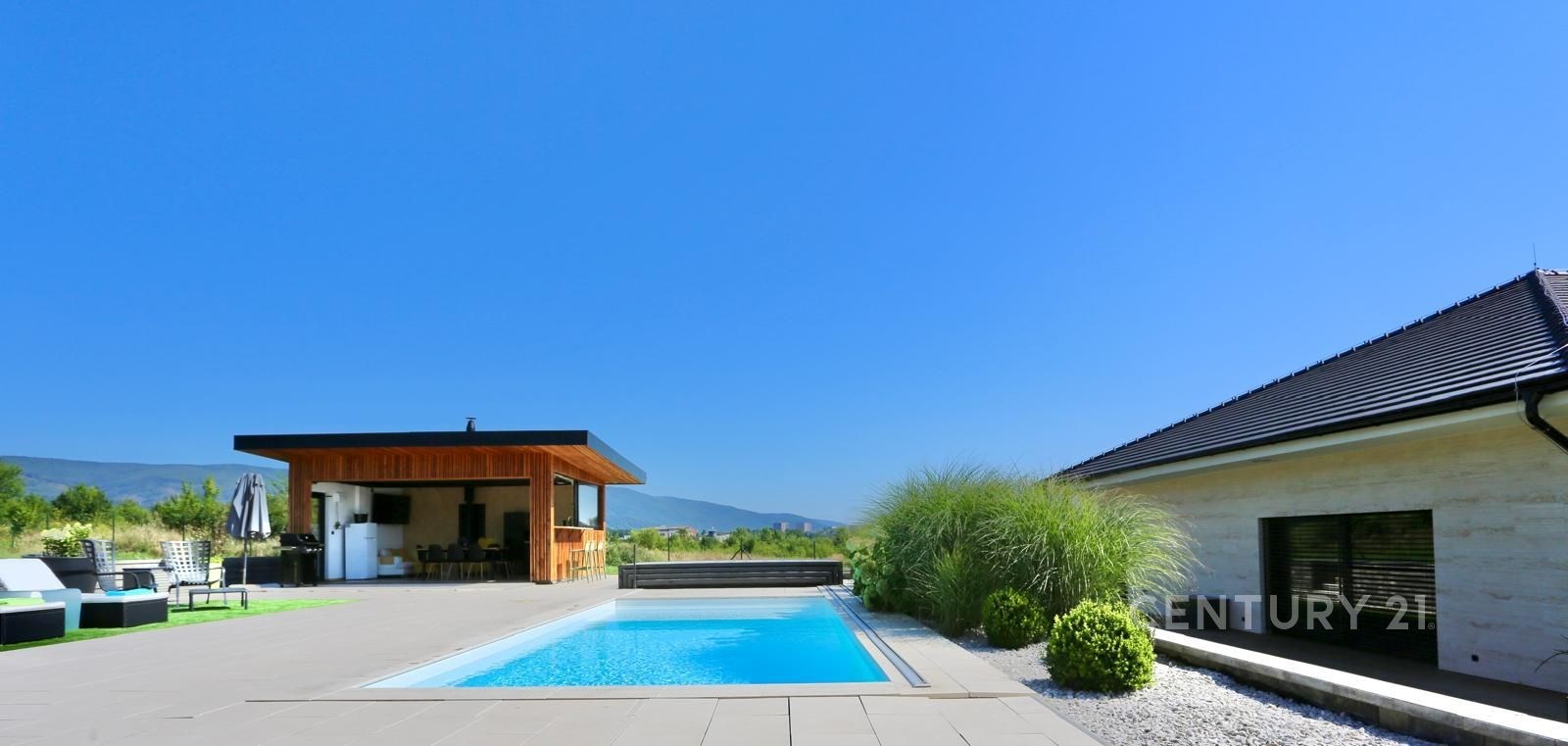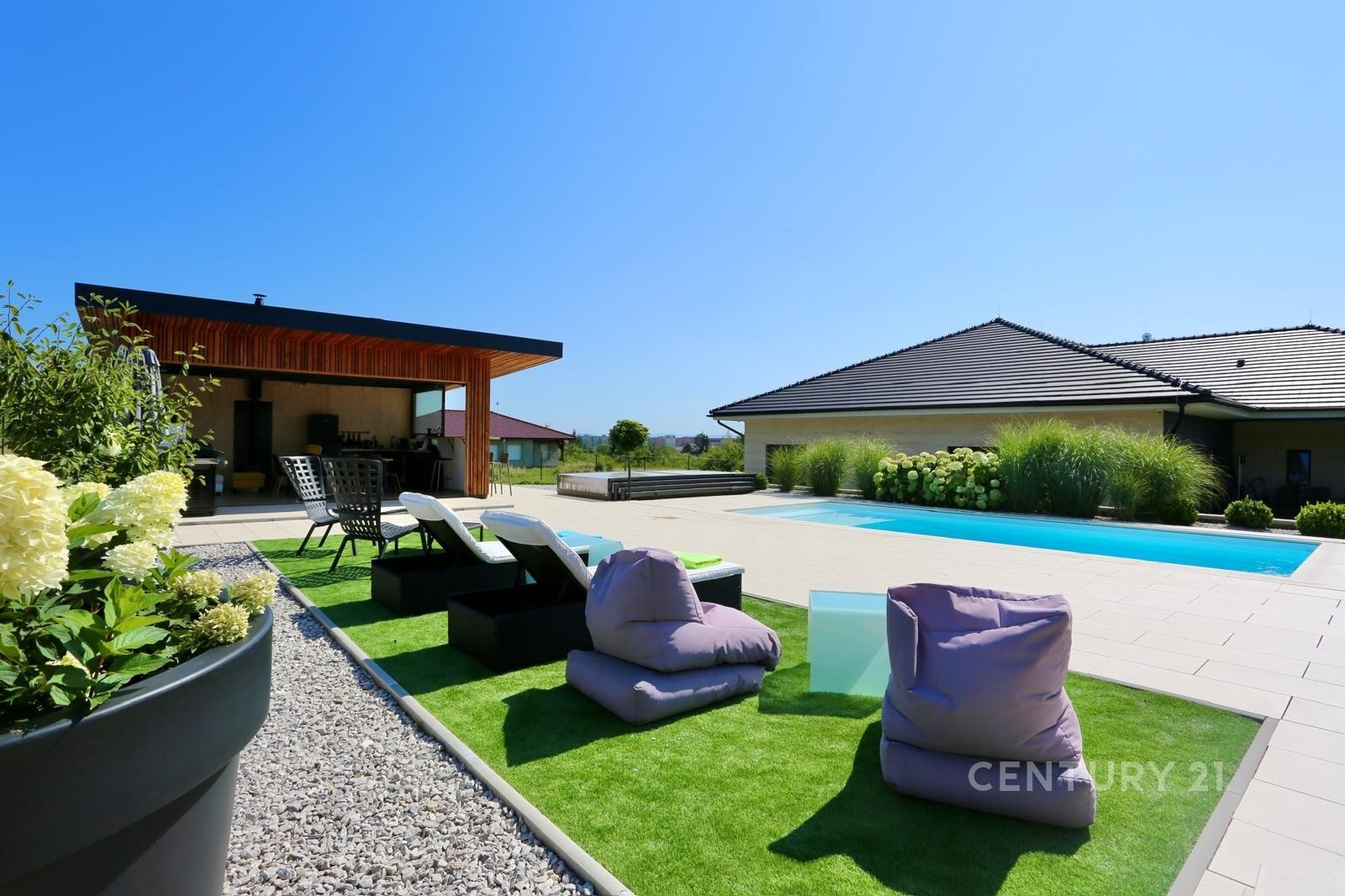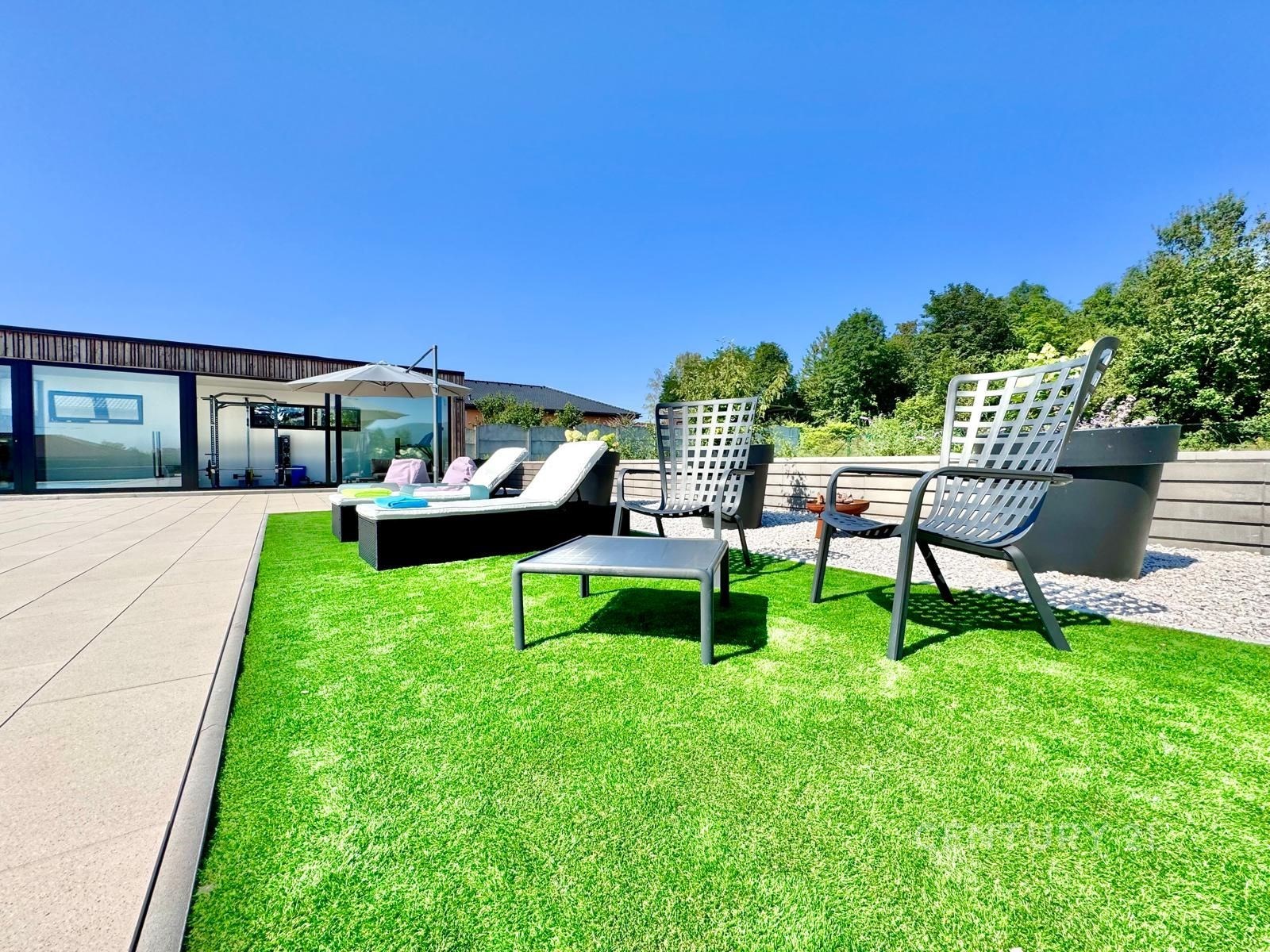 Nemovitost nabízí také terasu o ploše 44.3 m2, která je perfektní pro venkovní stolování a odpočinek. Na zpevněné plochy byla použita kvalitní dlažba kámen zn. TRAVENTIN včetně schodiště, které odděluje dům od bazénu a prostor kolem, který navazuje na letní domek se zázemím krbových kamen, saunou a možností občerstvení.