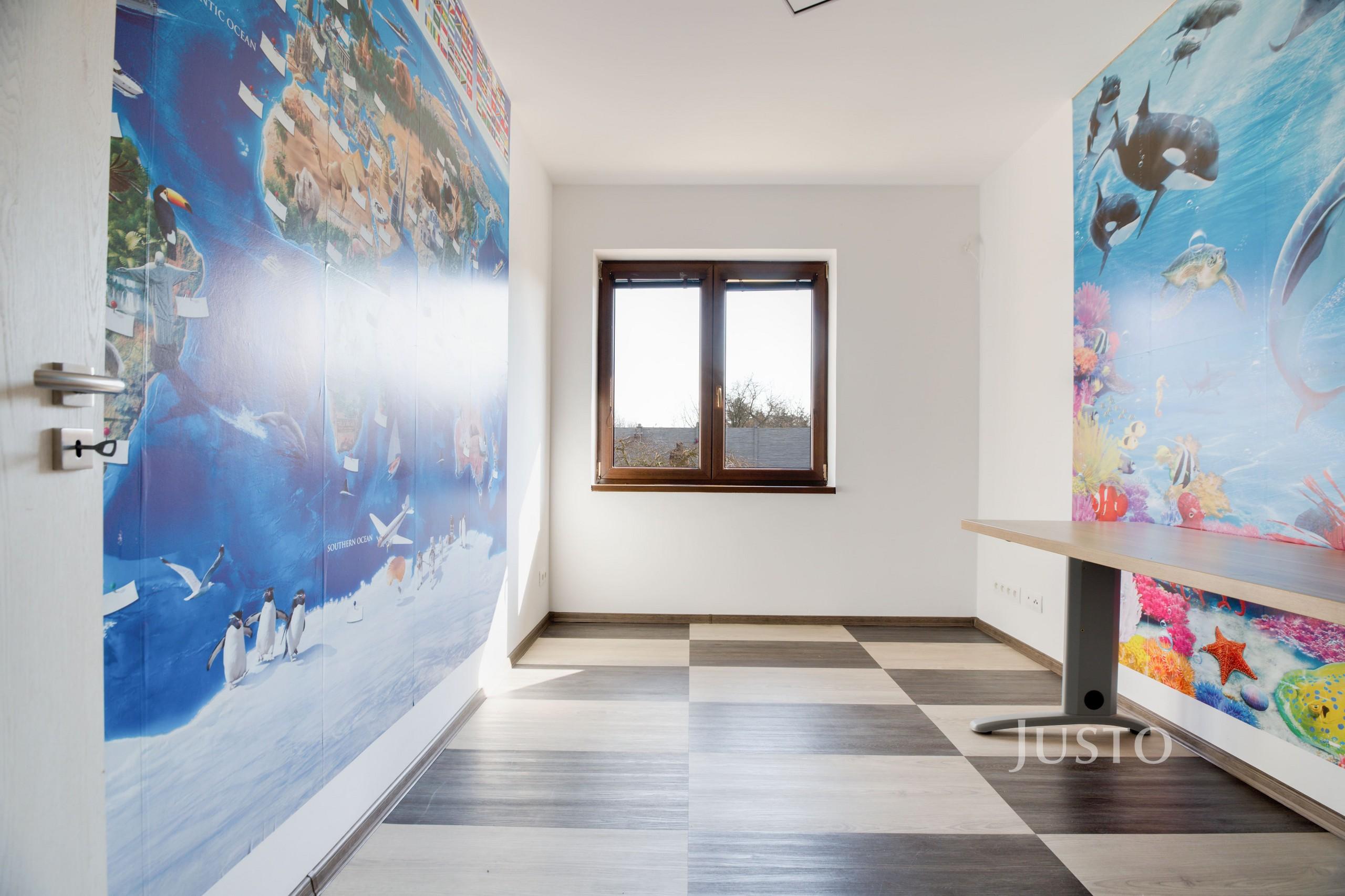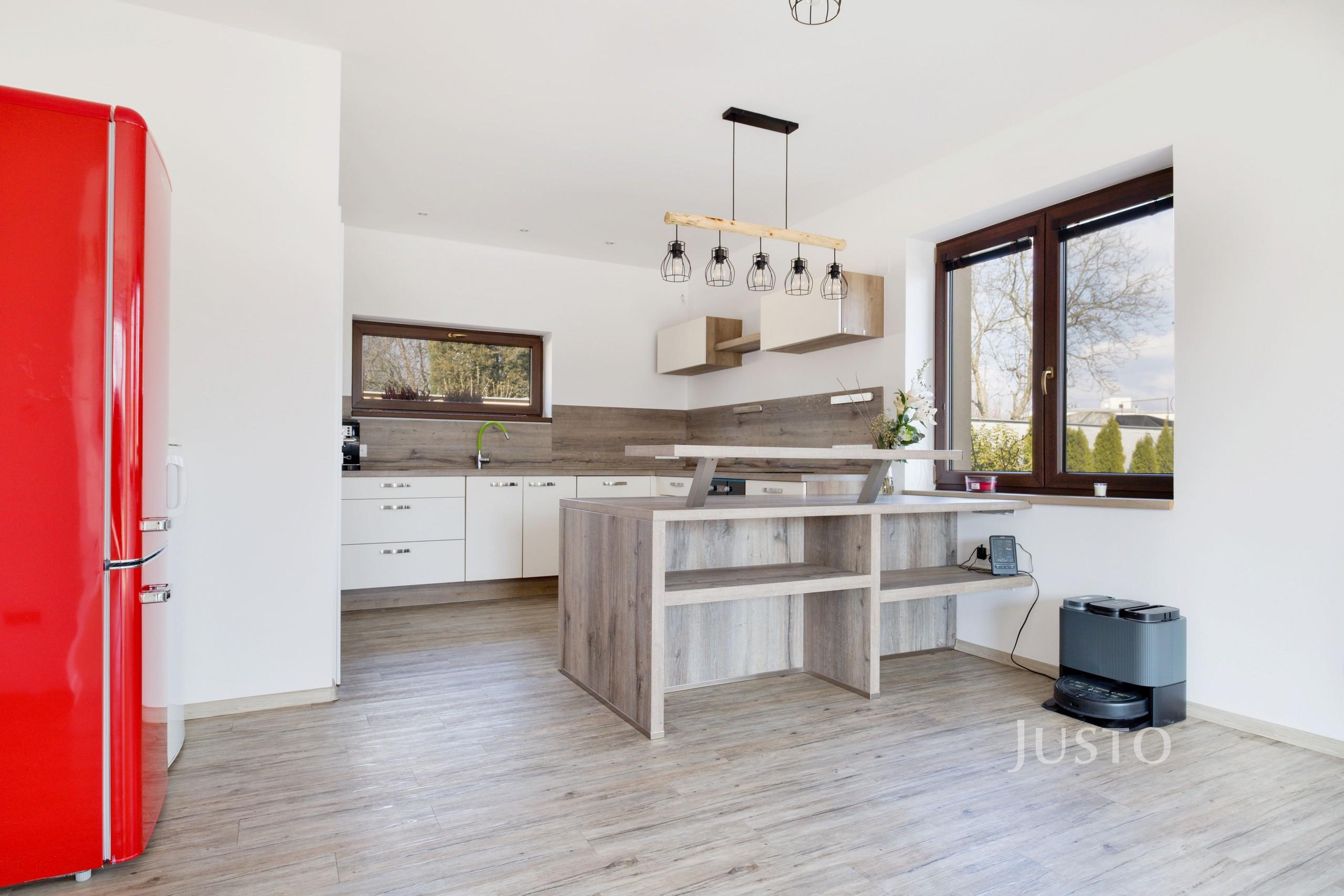 Dispozice domu nabízí 6 pokojů, které zajišťují dostatek místa i pro vícečlennou rodinu. Kuchyň je vybavena na míru vyrobenou kuchyňskou linkou s vestavěnými spotřebiči, jako je myčka, indukční varná deska a trouba. Koupelna splňuje vysoké standardy a nabízí vanu i sprchový kout. Samozřejmostí jsou vestavěné skříně, které poskytují dostatek úložného prostoru. Dům je vybaven moderními technologiemi – podlahovým vytápěním napojeným na tepelné čerpadlo, příprava na zabezpečovací systém, plastovými okny se žaluziemi a sítěmi proti hmyzu. Interiér je světlý, vzdušný, s příjemnou výškou stropů 2,65 m a kvalitními obložkovými zárubněmi.