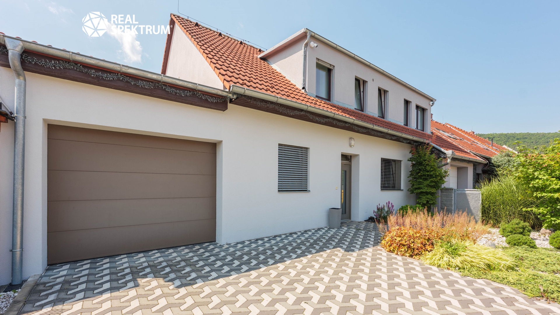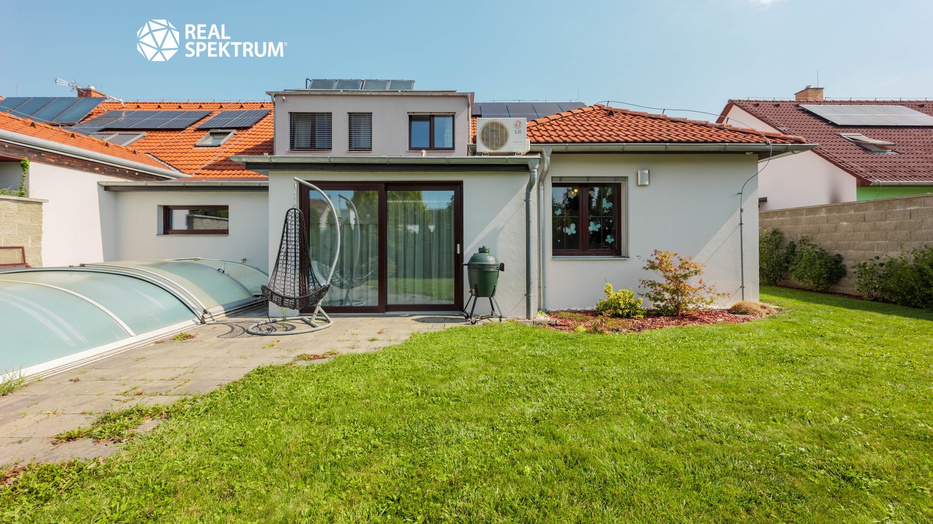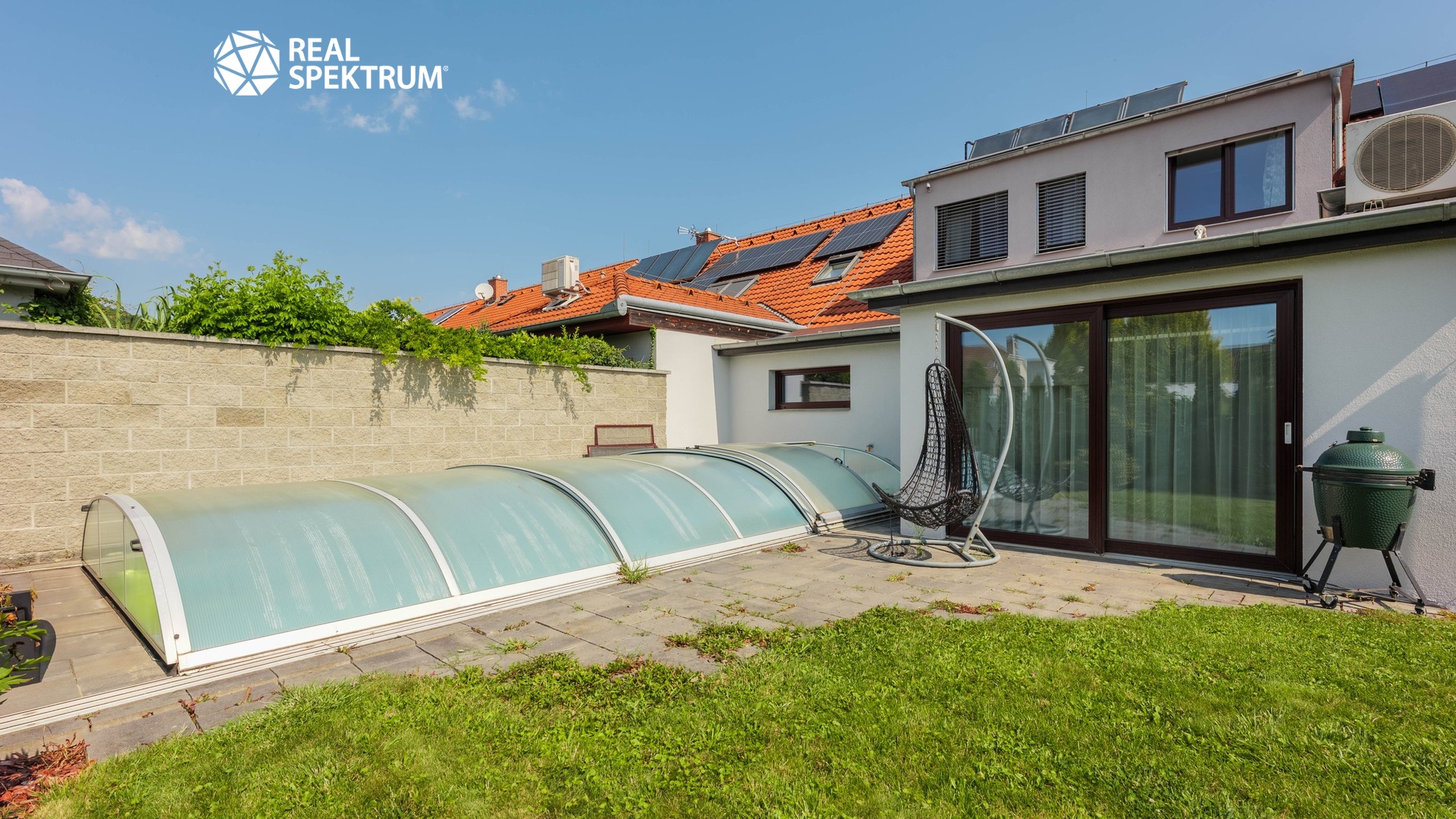 K domu náleží pečlivě udržovaná zahrada se závlahovým systémem, terasa pro venkovní posezení a venkovní bazén se zastřešením, které umožňuje jeho využití až do podzimních měsíců. Velkou přidanou hodnotou je fotovoltaická elektrárna zajišťující energetickou úspornost provozu domu i možnost nabíjení elektromobilu. Parkování je zajištěno dvěma garážemi s kapacitou až pro tři automobily a další plochou před domem.