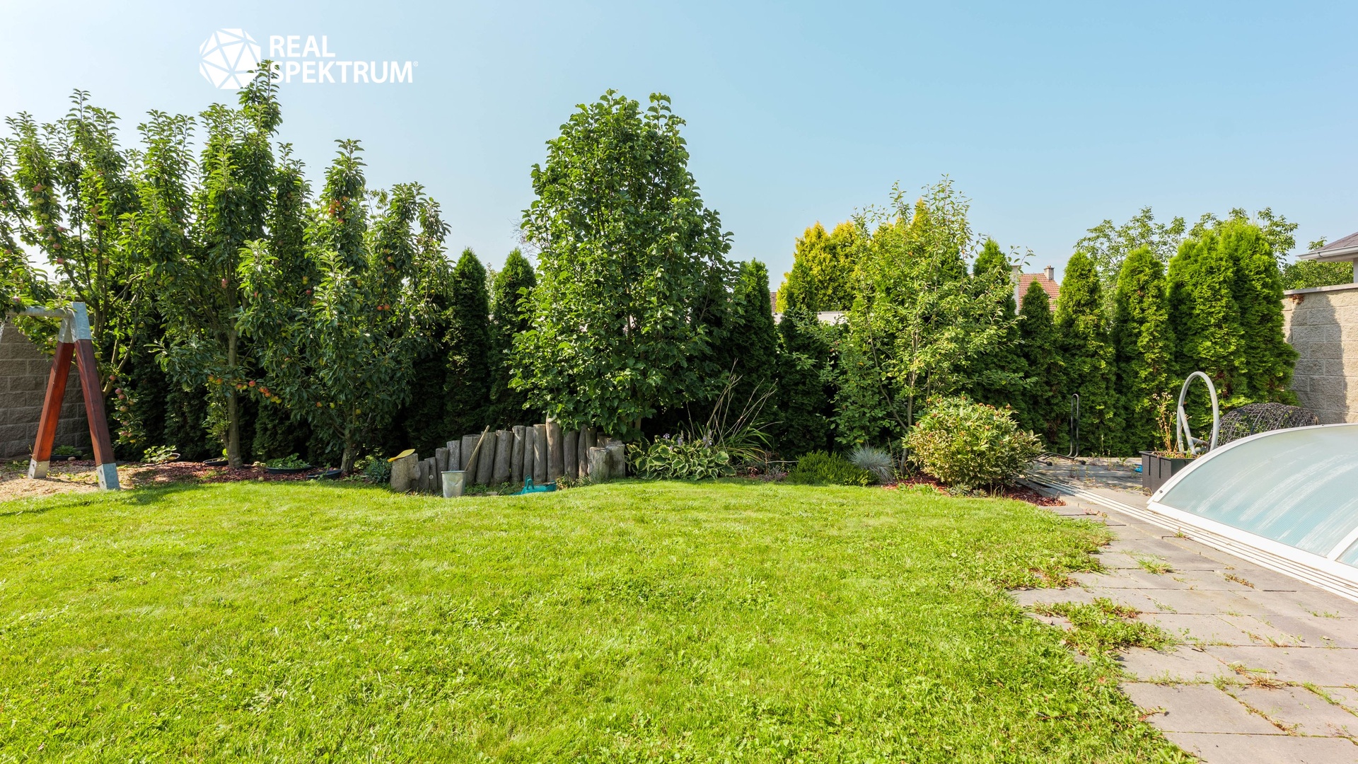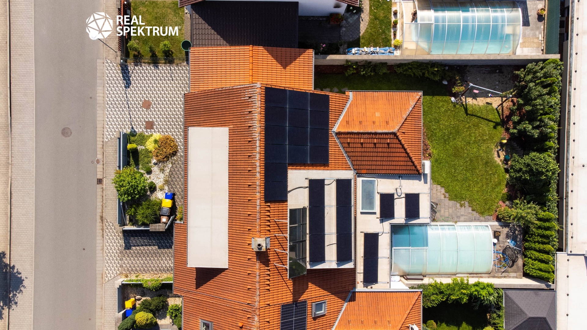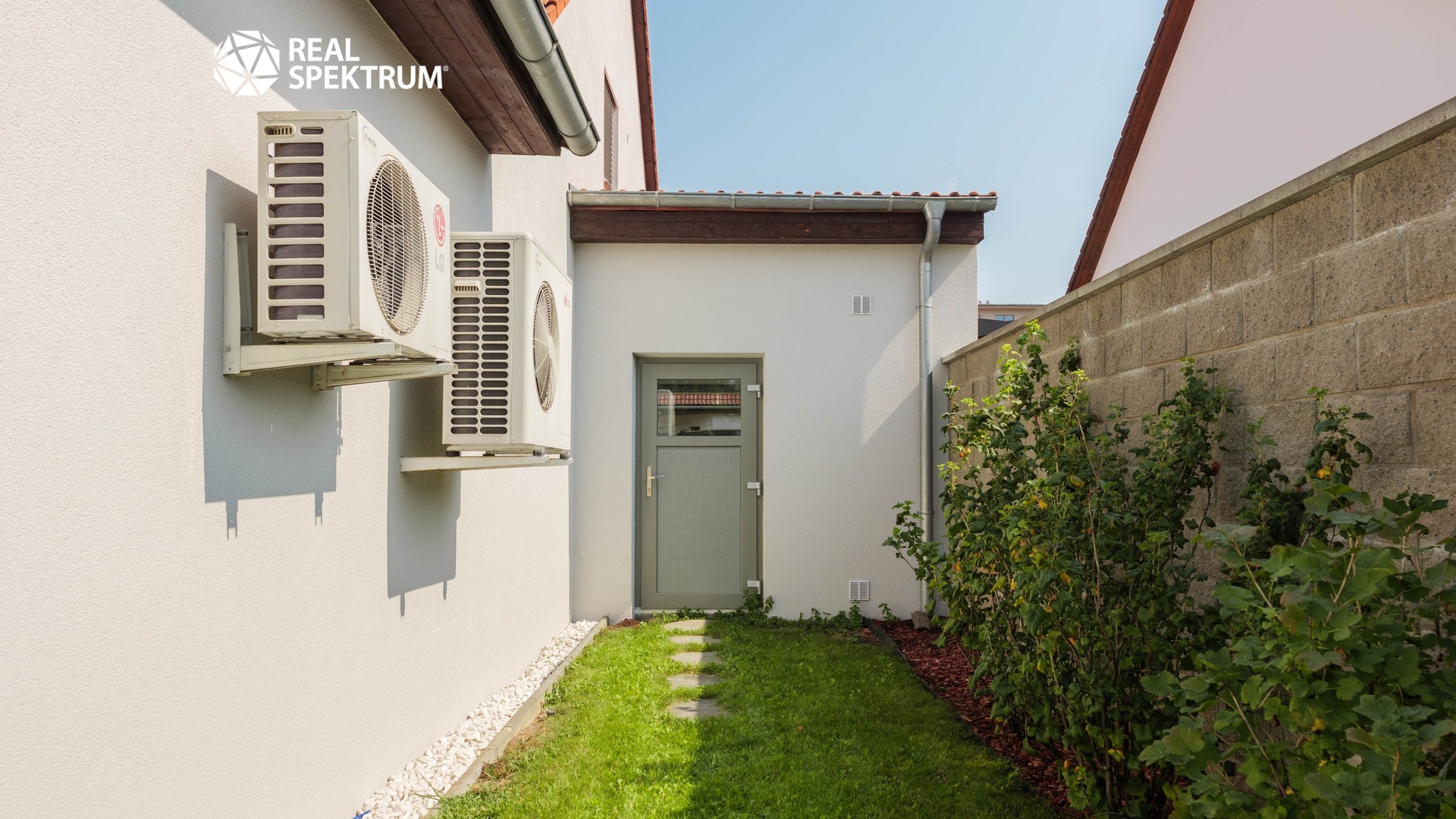 K domu náleží pečlivě udržovaná zahrada se závlahovým systémem, terasa pro venkovní posezení a venkovní bazén se zastřešením, které umožňuje jeho využití až do podzimních měsíců. Velkou přidanou hodnotou je fotovoltaická elektrárna zajišťující energetickou úspornost provozu domu i možnost nabíjení elektromobilu. Parkování je zajištěno dvěma garážemi s kapacitou až pro tři automobily a další plochou před domem.