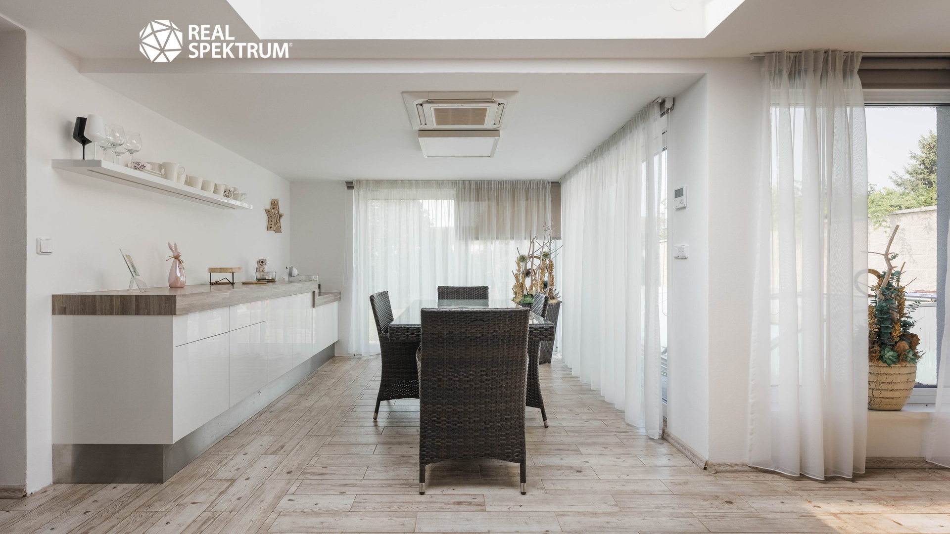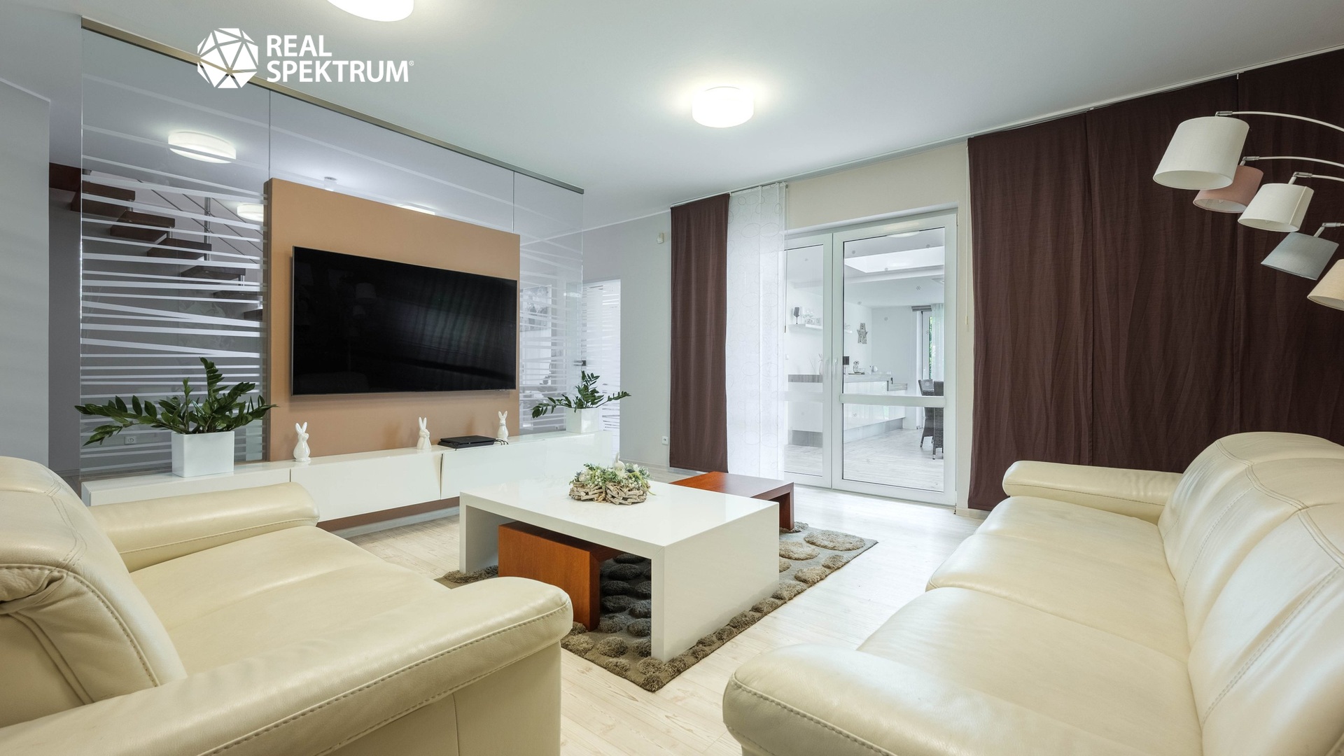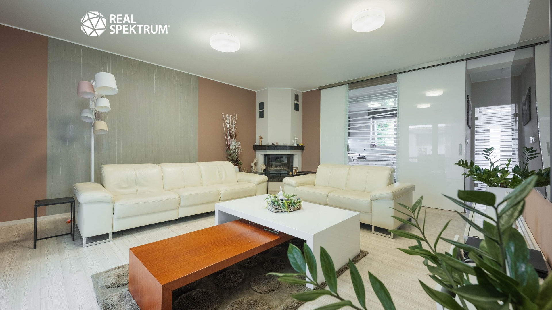 Dominantou přízemí je vzdušný obývací pokoj o velikosti téměř 46 m², který navazuje na moderní kuchyni a elegantní zimní zahradu. Ta poskytuje ideální prostor pro relaxaci během celého roku a propojuje interiér se zahradou.
