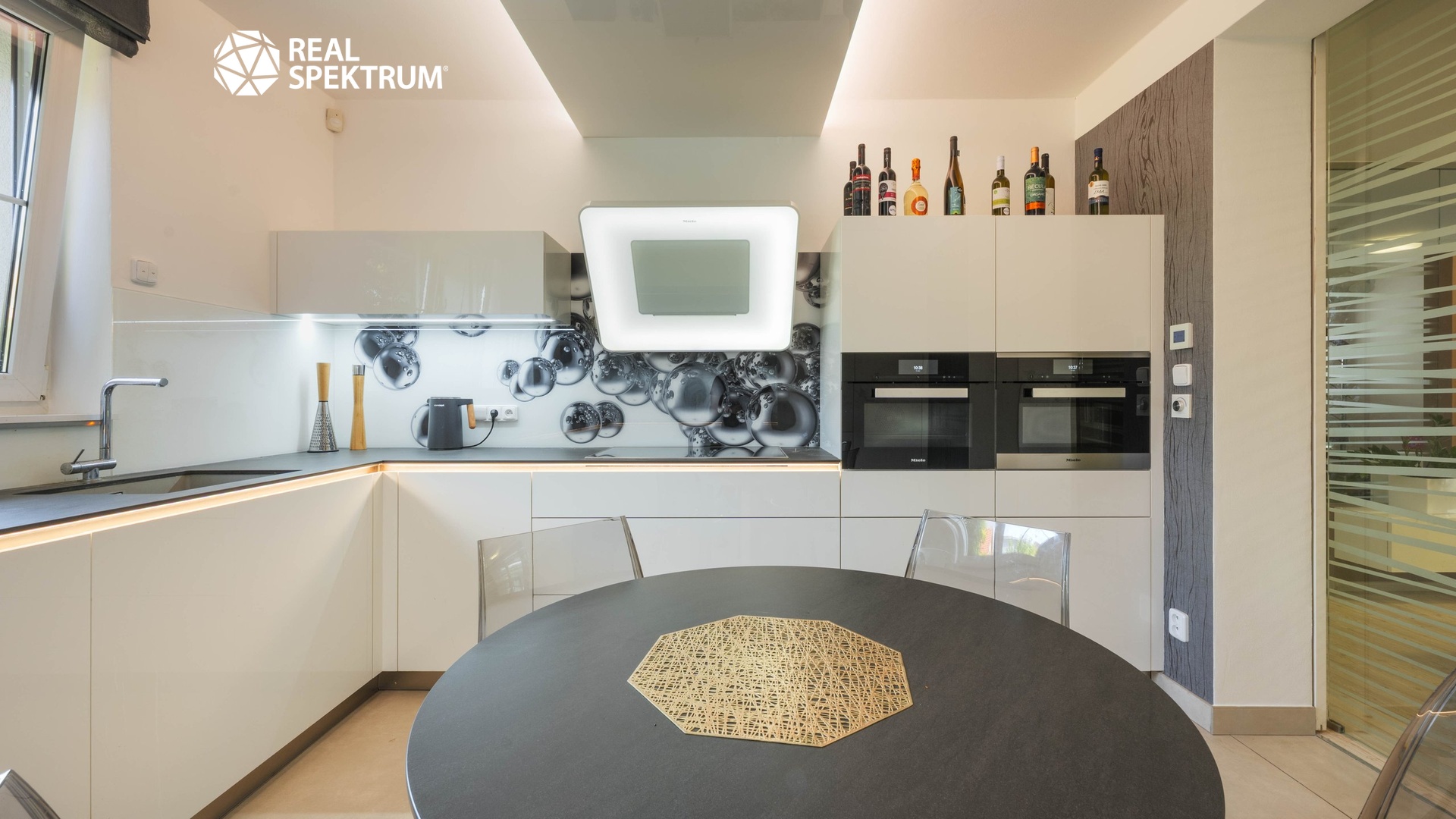 Nadčasová kuchyně v minimalistickém designu nabízí dostatek pracovní plochy i úložných prostor. Dominantou jsou vestavné spotřebiče značky Miele, které zaručují špičkovou kvalitu, komfort při vaření i dlouhou životnost.