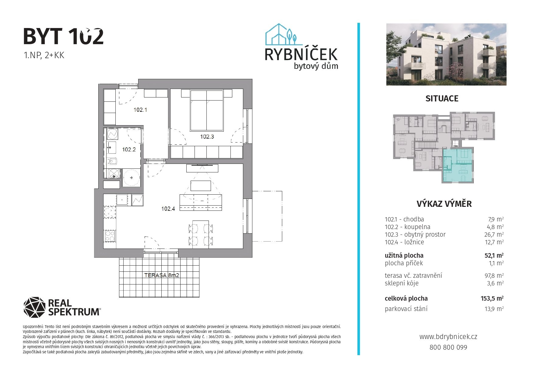 Dispozice: chodba (7,9 m²), pokoj s kuchyňským koutem (26,7 m²), pokoj (12,7 m²), koupelna s WC (4,8 m²), terasa vč. zatravnění (89,8 m²), sklepní kóje (3,6 m²), parkovací stání (13,9 m²)