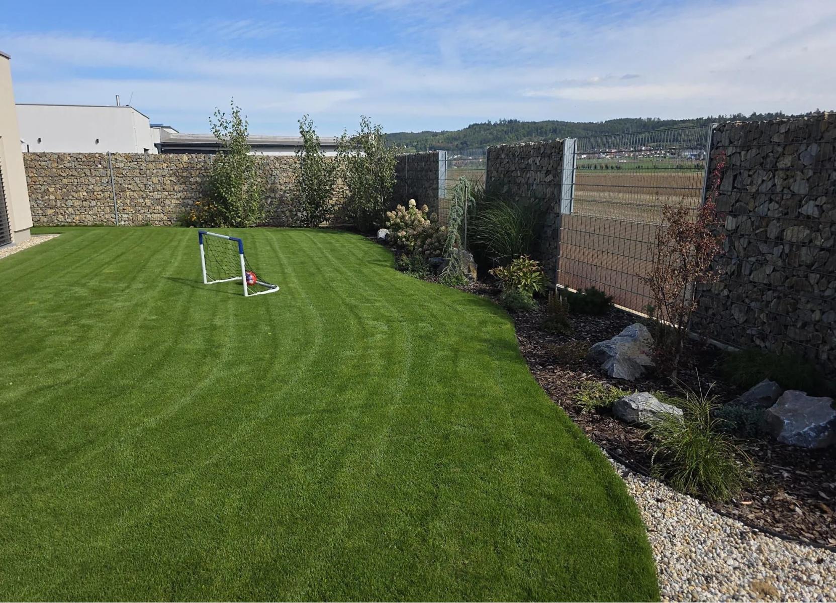 Zahrada o výměře 565 m je bez dalších staveb, osázena travou, okrasnými keři a dřevinami, zakrslými stromky a sezónními květinami, je zde přívod elektřiny pro budoucí pergolu a zahradní domek. Na zahradě je vybudovaný zavlažovací systém, dětské pískoviště a průlezka.