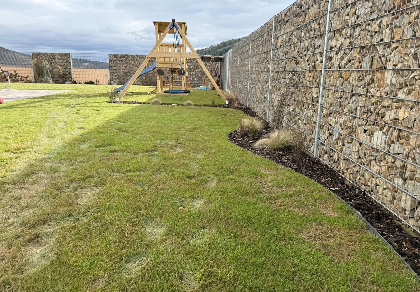 Pozemek je kompletně oplocený, plot je umístěný na vlastním pozemku, nikoliv na hranici se sousedním pozemkem. Plot je osazen dvojitou bránou pro vjezd a brankou pro pěší. Gabionový plot je v přední části pozemku vysoký 1,2 m, v zadní části dosahuje výšky 2 m.