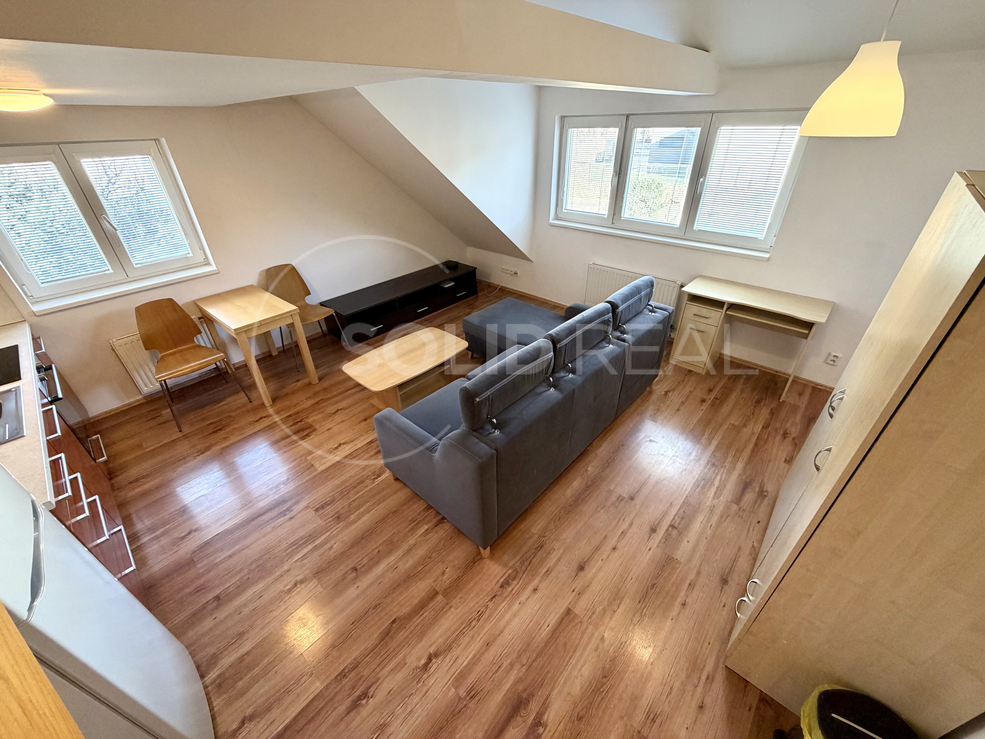 Byt působí velmi vzdušně a světlě. Obytný prostor je tvořen obývacím pokojem s kuchyňským koutem, ložnicí, koupelnou a vstupní chodbou. Z obývacího pokoje je vstup na balkon s dřevěnou podlahou, kde si můžete vychutnat ranní kávu či večerní posezení.