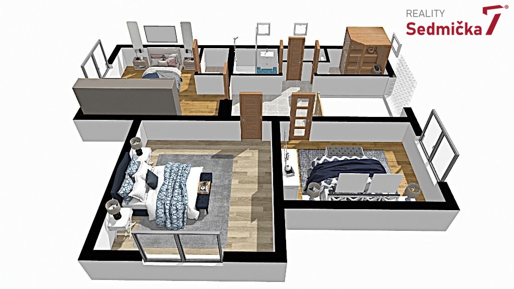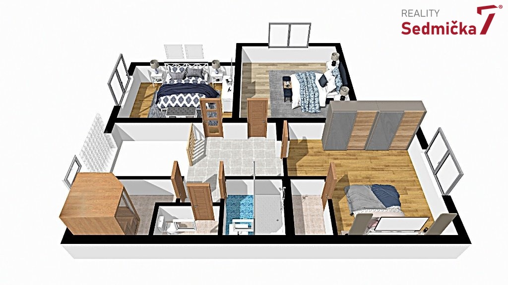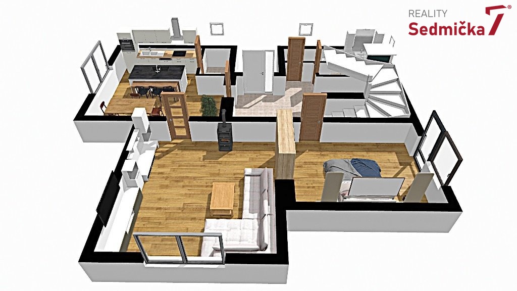 Dům nabízí komfortní dispozici vhodnou i pro větší rodinu nebo dvougenerační bydlení. V přízemí se nachází vstupní hala se schodištěm, kuchyň, prostorný obývací pokoj s krbovými kamny, koupelna a WC. V patře jsou tři samostatné pokoje, koupelna, WC a také sauna.