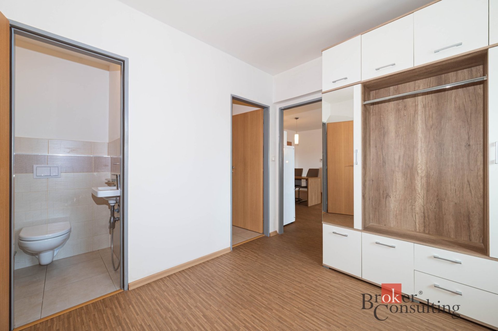 Dispozice bytu tvoří obývací pokoj s kuchyňským koutem, samostatný pokoj, koupelna se sprchovým koutem a toaletou. Součástí bytu je základní vybavení (viz foto), které je možné po domluvě ponechat nebo odstranit.