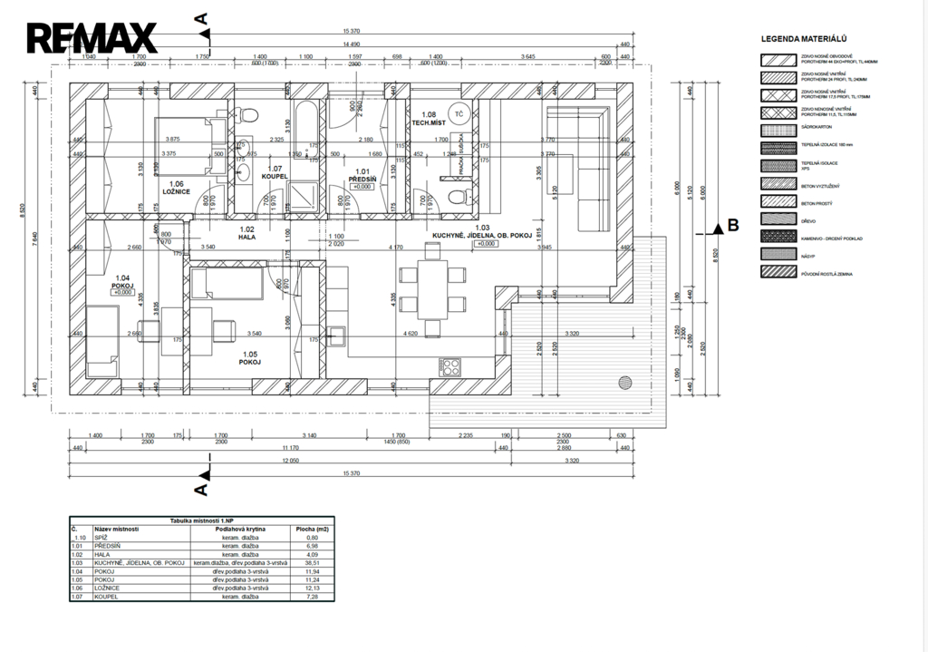 Prostorný obývací pokoj s jídelnou a kuchyní (38,51 m²) – s přímým vstupem na terasu a možností napojení na venkovní kryté posezení.