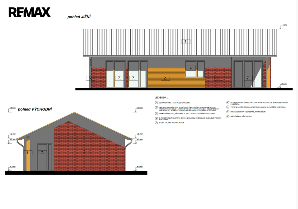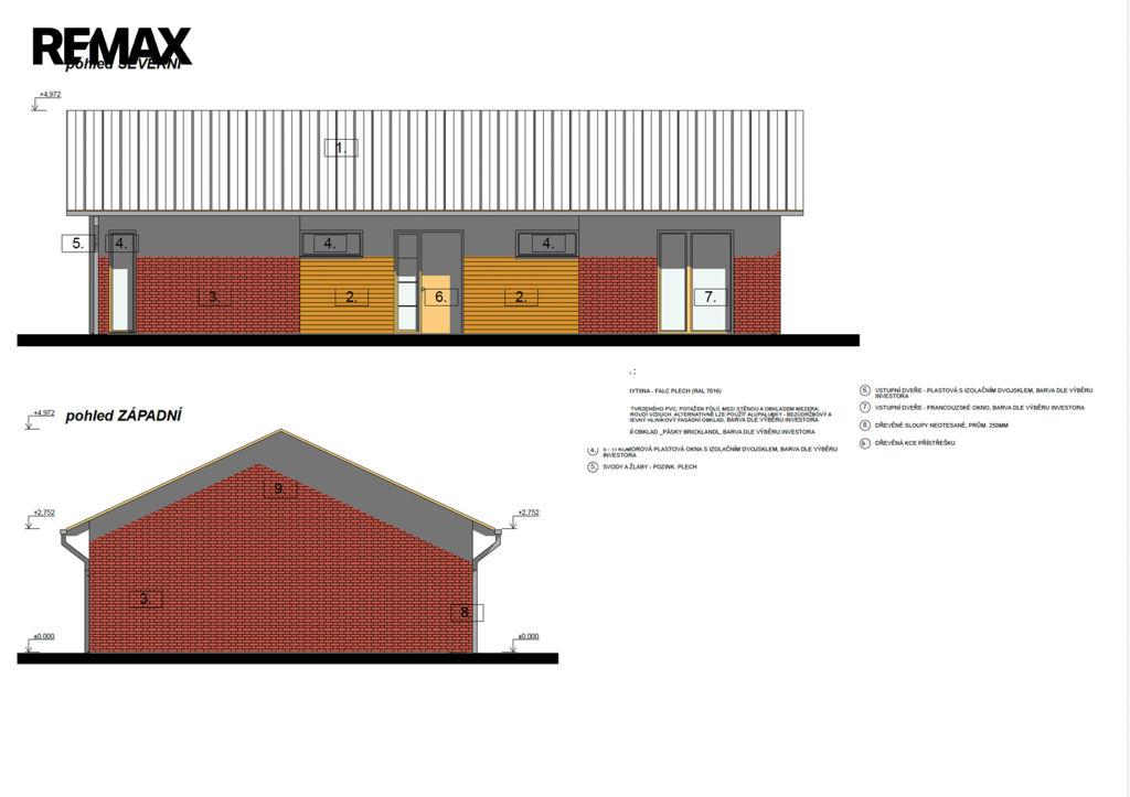 Kombinace cihlového páskového obkladu, tvrdého PVC s fólií, omítky a dřeva.