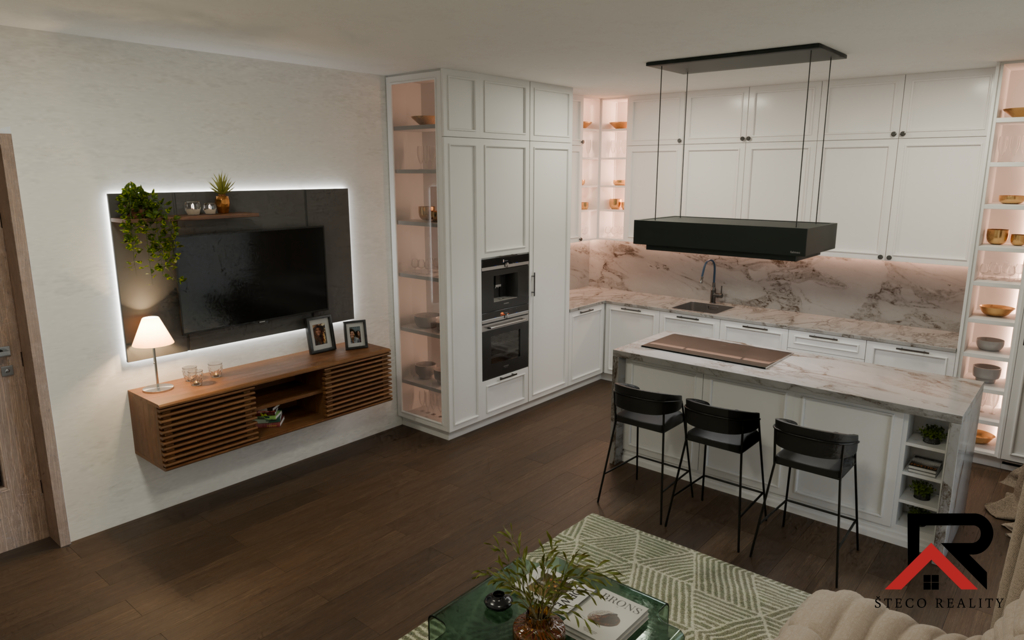 Interiér bytu je vybaven vinylovými podlahami, na výběr jsou čtyři dekory, které umožňují přizpůsobení prostoru podle individuálních preferencí. Obývací pokoj je moderně řešen a slouží jako srdce bytu, přičemž je zde umístěn videotelefon, který funguje jako základ chytré domácnosti – skvělý prvek pro zvýšení bezpečnosti a pohodlí.