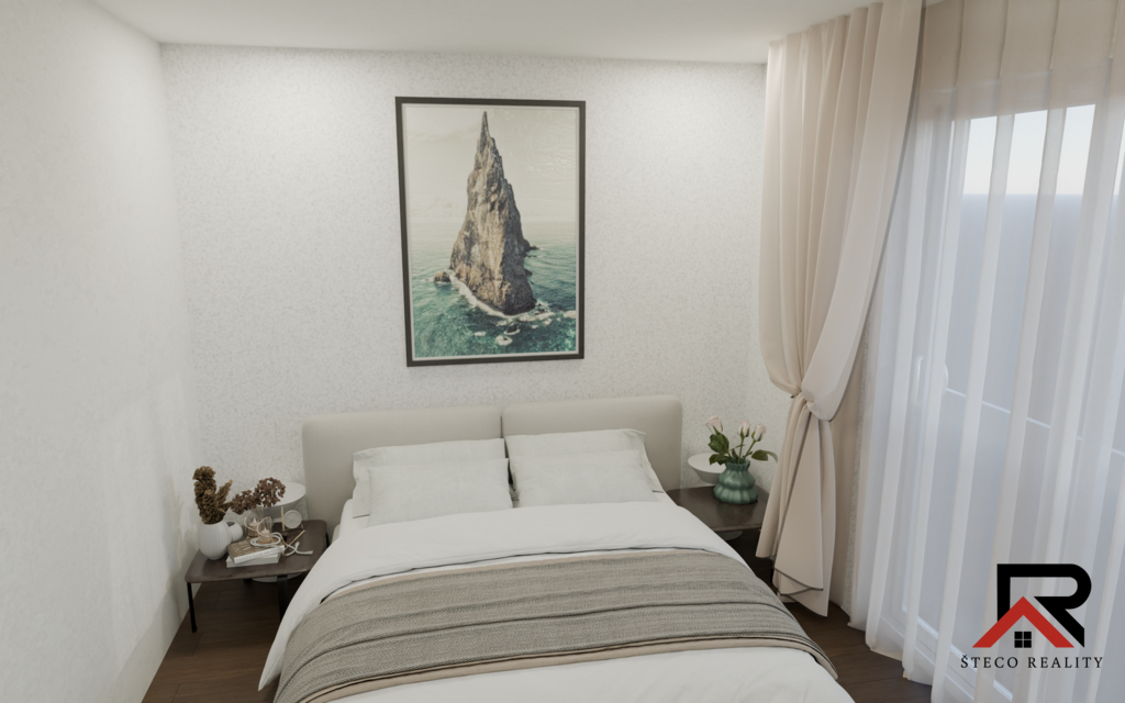 Interiér bytu je vybaven vinylovými podlahami, na výběr jsou čtyři dekory, což umožňuje přizpůsobení prostoru dle individuálních preferencí. Obývací pokoj je moderně řešen a slouží jako srdce bytu, přičemž je zde také umístěn videotelefon, který funguje jako základ chytré domácnosti – ideální prvek pro zvýšení bezpečnosti a pohodlí.