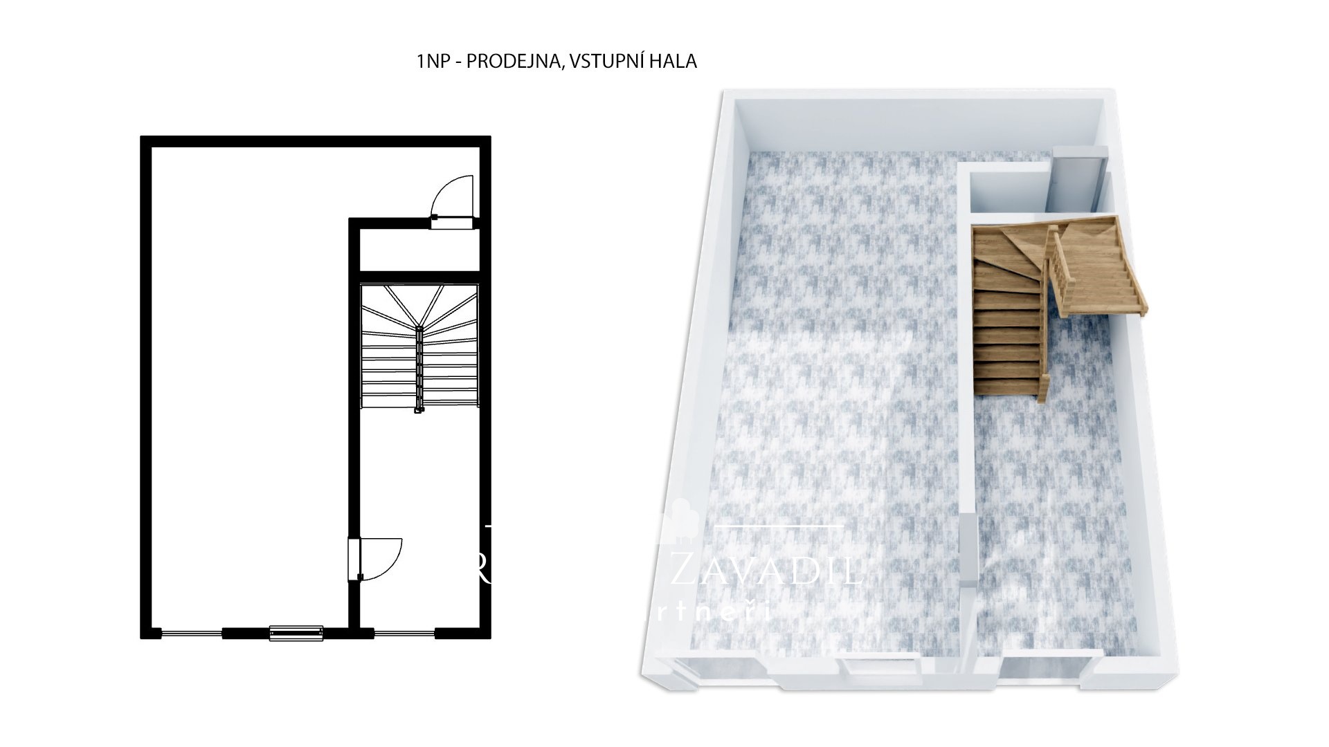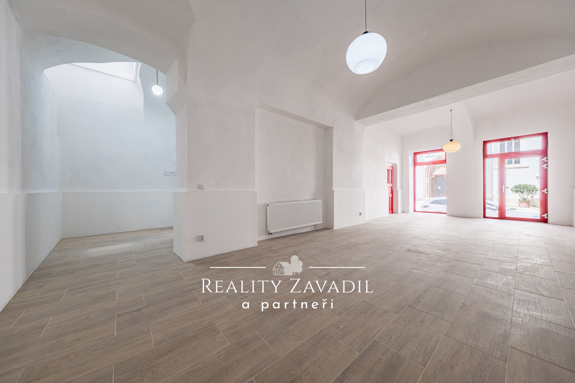 V přízemí se nachází prostor o výměře 54 m², tvořený hlavní místností a sociálním zázemím. Díky své dispozici je ideální ke komerčnímu využití, například jako obchod, kancelář, služby nebo ateliér.
