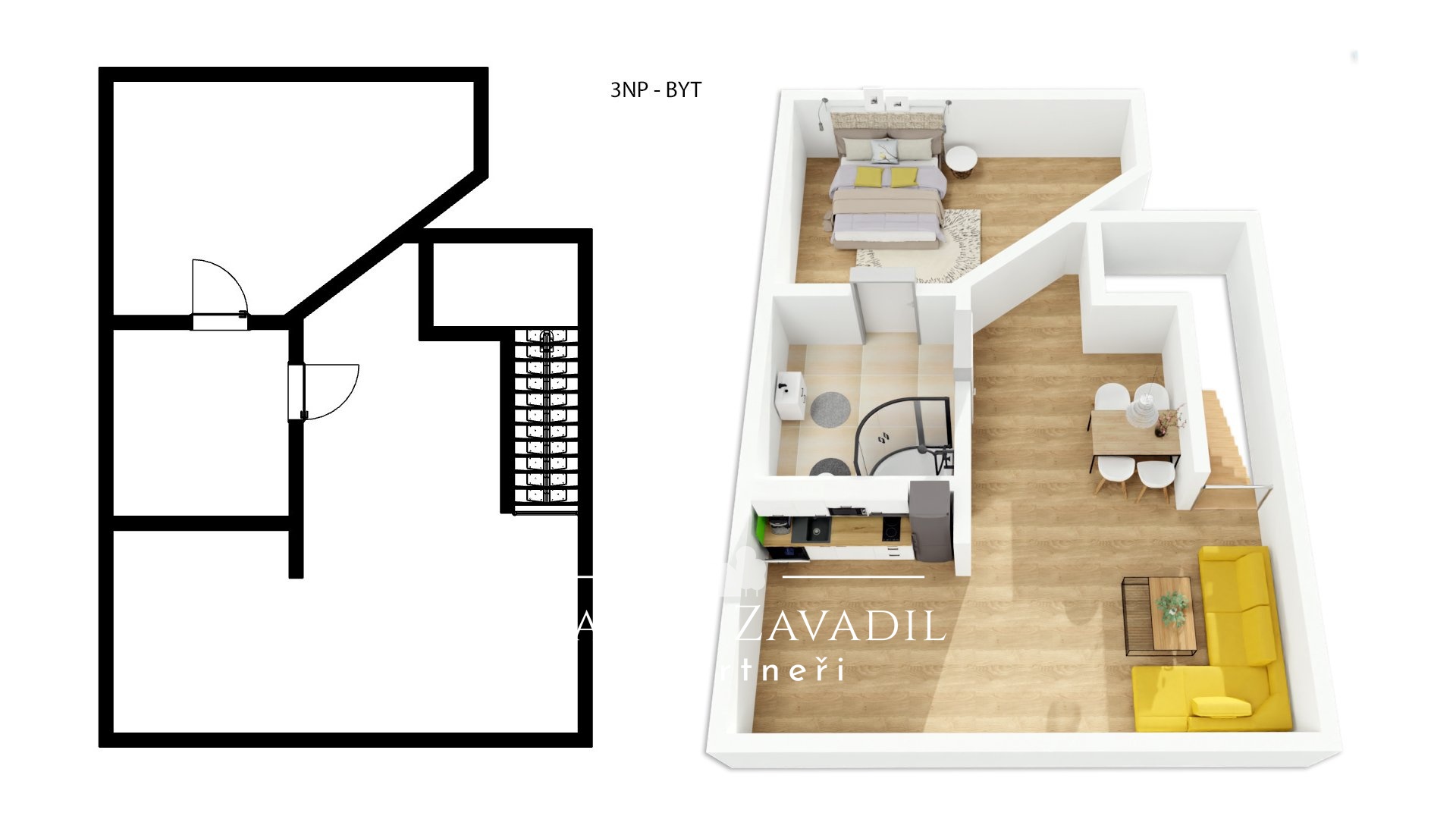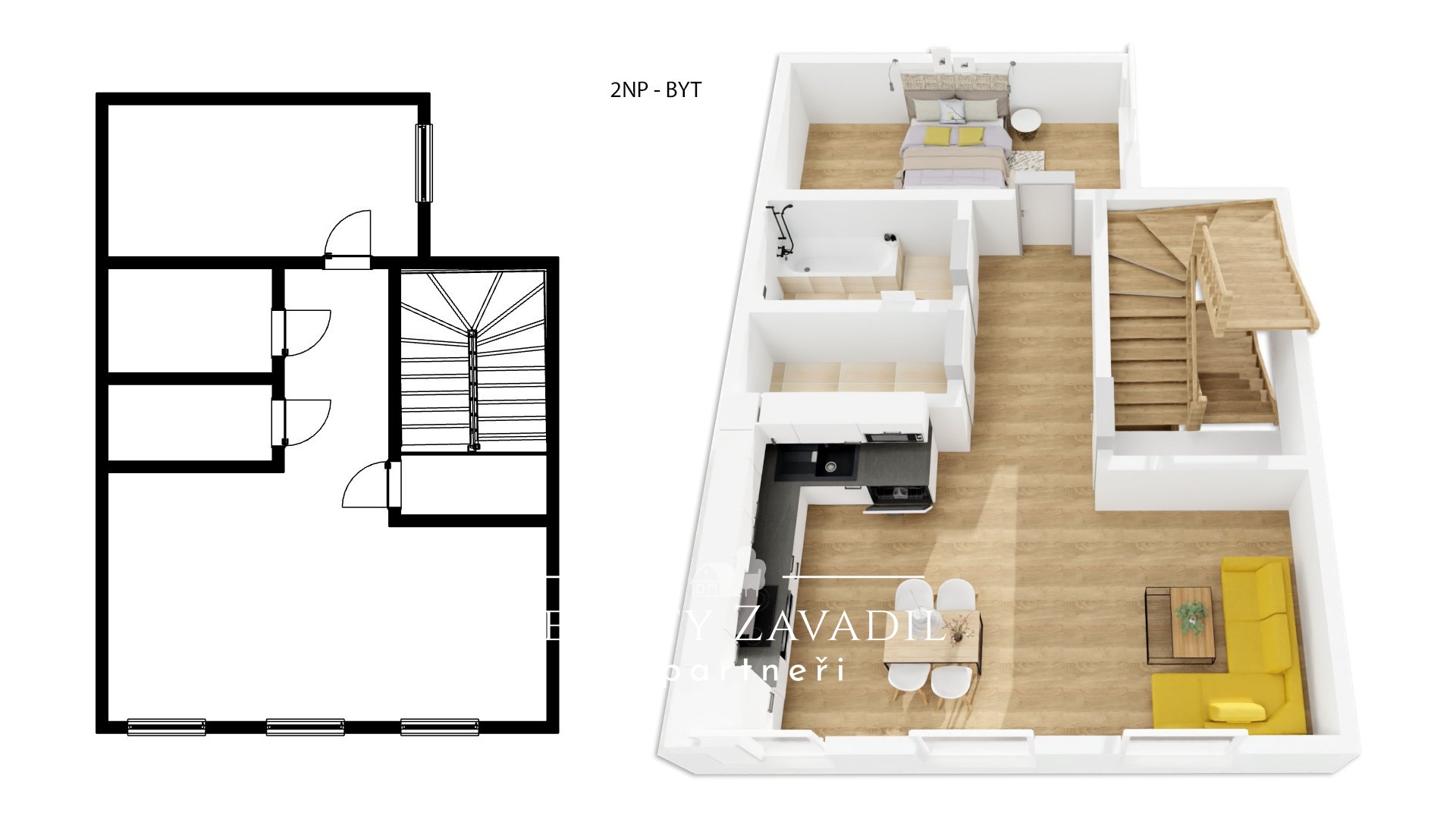 Ve 2. patře se nachází další byt o dispozici 2+kk o výměře 65 m², který disponuje prostorným obývacím pokojem s jídelním koutem, ložnicí a koupelnou.