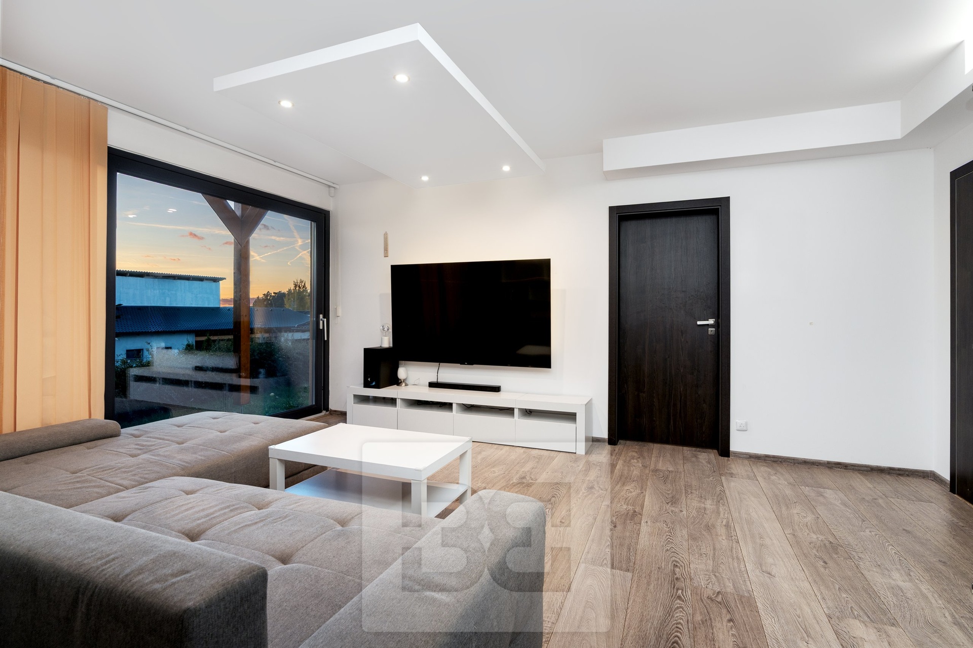 V přízemí naleznete prostor o dispozici 3+1 - prostornou kuchynň s barovým pultem, obývacím pokojem a hlavní ložnicí, kdy ve všech třech místnostem jednu celou stěnu nahrazuje francouzské okno s orientací na jihozápad. Dále v přízemí naleznete menší ložnici, šatnu, koupelnu s vanou, samostatnou toaletu a dvě technické místnosti. Celková rozloha je 105,5 m². Přízemí bylo původně koncipováno pro prostory soukromé ordinace s přední recepcí a oddělenými místnostmi. Časem byl tento koncept proměněn na rodinné bylení, ale v případě zájmu nebude vyžadovat větší investice se k původnímu záměru obchodních prostor vrátit.
