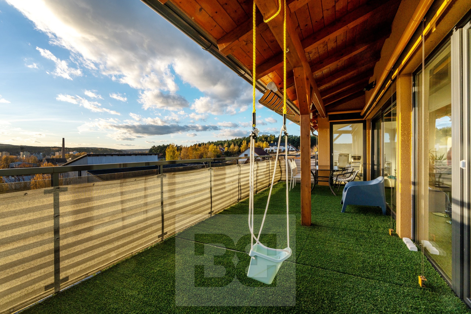 První patro má dispozici dispozici 3kk o celkové výměře 102m² a dominuje mu terasa o celkové velikosti 22m² a francouzským oknem po celé délce a šířce stěny, díky kterému si užijete opravdu překrásný výhled i z kuchyně, jídelny či obývacího pokoje. Ve středu kuchyně je ostrůvek s barovými židlemi a sklokeramickou deskou značky baumatic, kde za zády je prakticky umístěna vestavěná trouba stejné značky. Dále v prvním patře najdete ložnici s vlastní koupelnou se sprchovým koutem a toaletou a soukromou šatnou, hlavní koupelnu s vanou a druhým pokojem, ke kterému také patří vlastní šatna. Podél celé chodny jsou vestavěné skříně, které poskytují dostatek úložného prostoru.