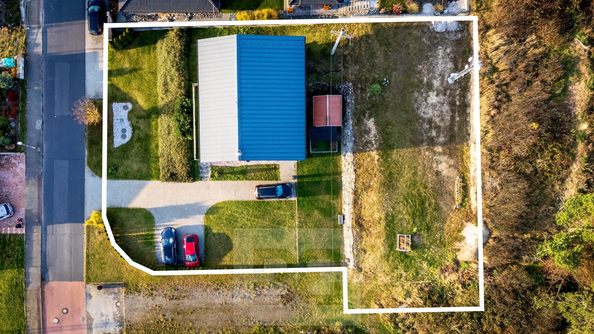 Venkovní pozemek poskytuje dostatek prostoru pro zřízení soukromého sportoviště nebo umístění bazénu. Parkování je možné až pro tři vozidla.