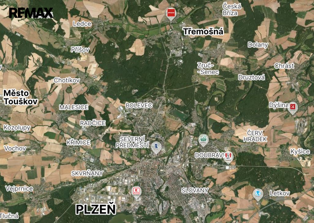 Pozemek je v ideální dojezdové vzdálenosti cca 15 minut jízdy autem z centra Plzně a na D5 jste za 20 minut.