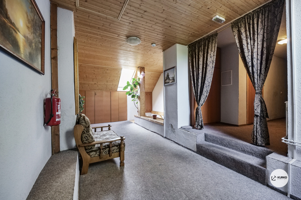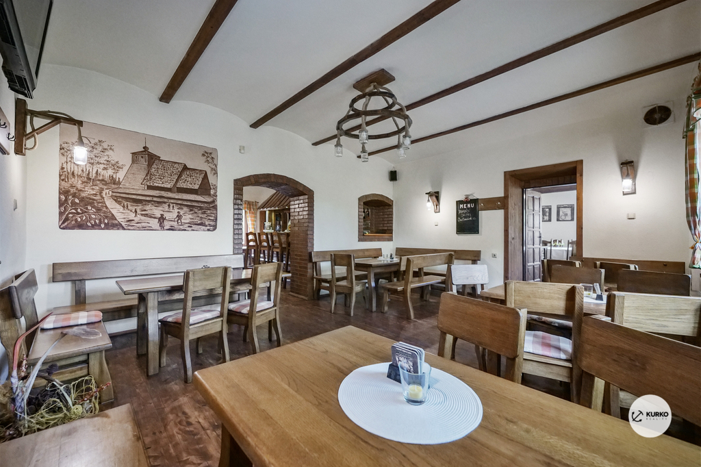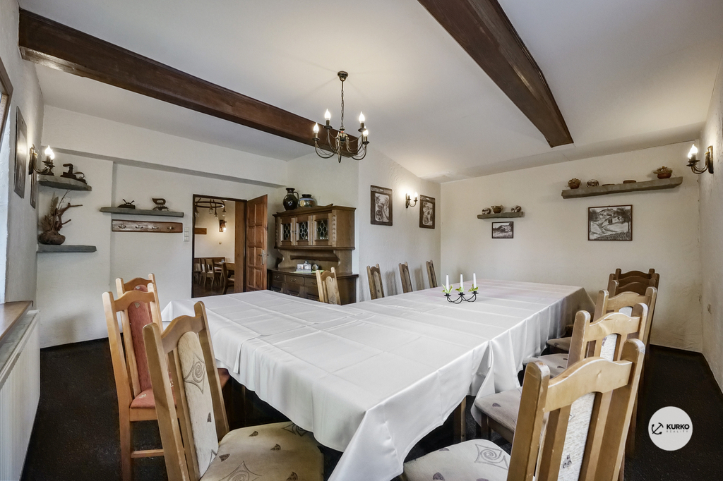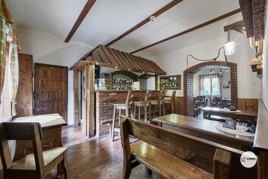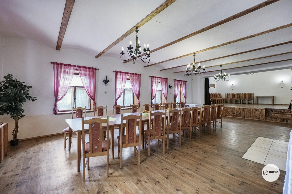 Dispozice objektu je navržena pro společenské a ubytovací využití. Najdeme zde prostorný sál s pódiem a krbem pro cca 45 osob, restauraci s kapacitou 50 míst a útulný salónek pro dalších 15 hostů. V patře je pět dvoulůžkových pokojů s internetem, které poskytují pohodlné zázemí pro hosty. Budova je napojena na obecní vodovod, odpad je řešen septikem, elektroinstalace je v mědi, střecha plechová, okna částečně plastová a vytápění je řešeno tuhými palivy. Součástí nemovitosti je také rozsáhlý pozemek o výměře 3 170 m², který nabízí další možnosti využití i dostatek prostoru pro zázemí hostů. Nemovitost je provozuschopná, nicméně pro moderní standard si vyžádá určité úpravy, což zároveň otevírá prostor k individuálnímu přetvoření dle vlastních představ.