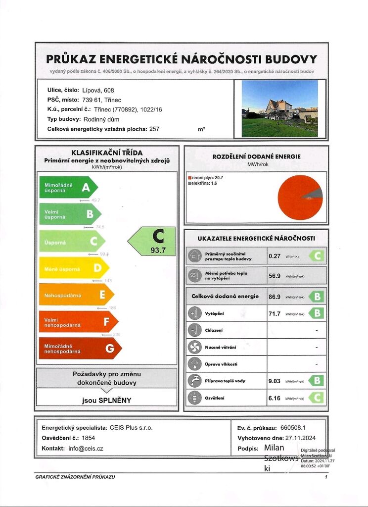 - Ukazatel energetické náročnosti budovy: 93.7 kWh/m²