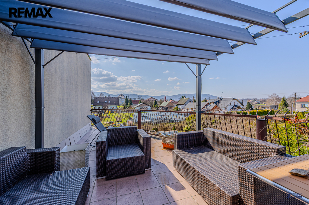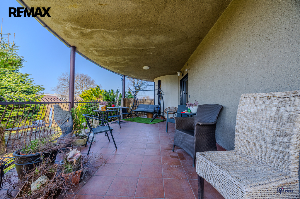 Součástí nemovitosti jsou dvě terasy, upravená zahrada, garáž pro dvě auta a další parkovací plochy. Užitná ploch domu činí 360 m², celková plocha pozemku je 1 139 m².