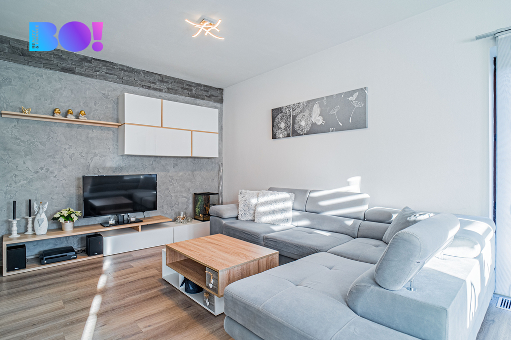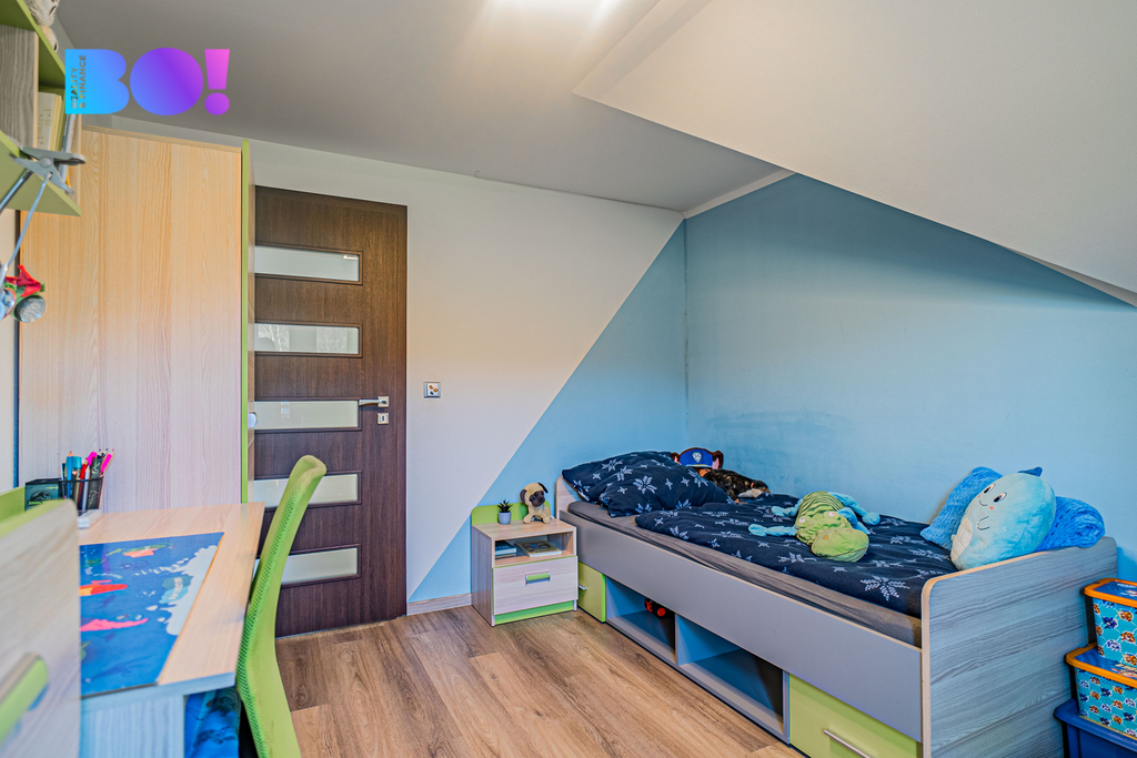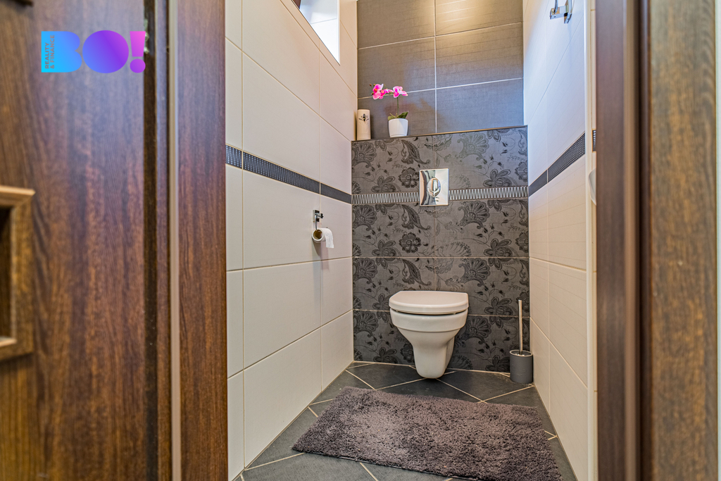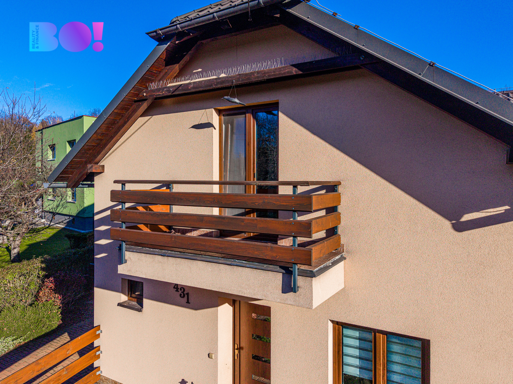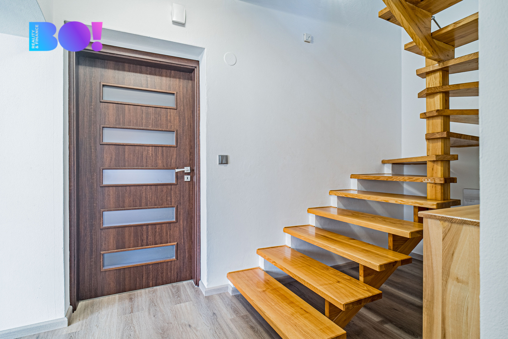 Přízemí domu tvoří prostorný obývací pokoj se vstupem na venkovní terasu, který volně navazuje na jídelní prostor a na novou moderní kuchyň. Kuchyně je kompletně vybavena spotřebiči – indukční varná deska, elektrická trouba, mikrovlnná trouba a myčka. K dispozici je také komora a samostatná toaleta. Podlahy jsou řešeny vinylovou krytinou na klik systém, v koupelně a na WC je položena dlažba. Dřevěné schodiště vede do prvního patra, kde se nacházejí dva dětské pokoje – každý s vlastním balkonem, ložnice se šatnou a balkonem a další pokoj vhodný jako pokoj pro hosty, pracovna nebo budoucí koupelna (příprava je hotová).