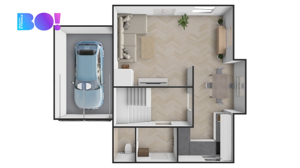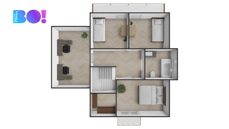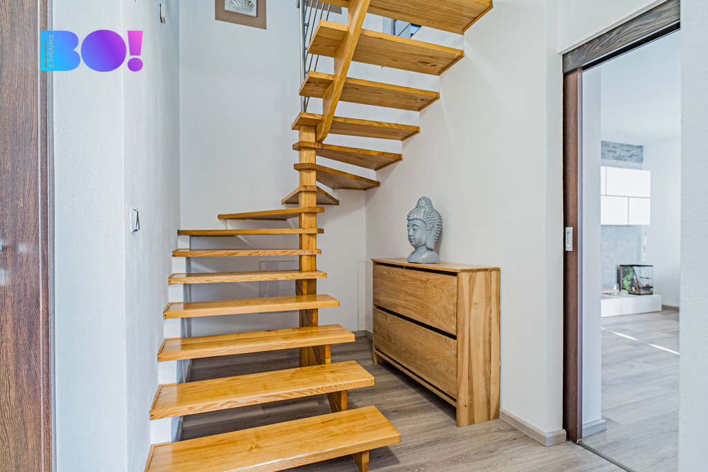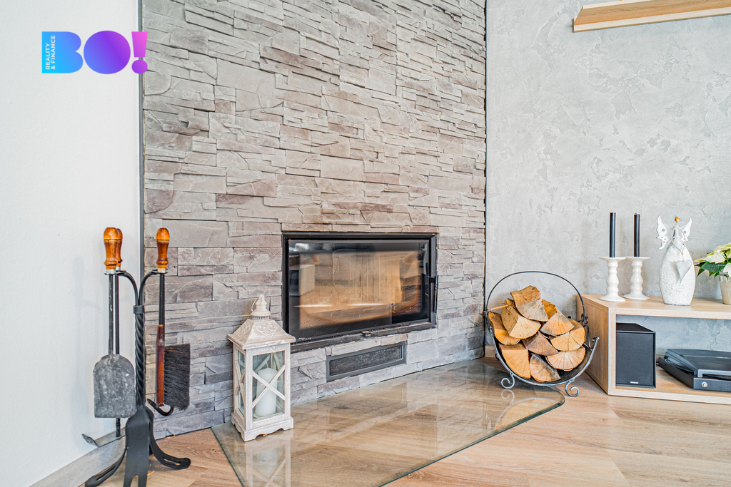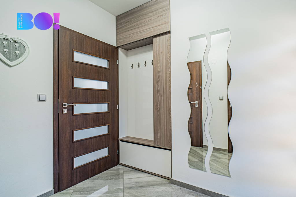 Přízemí domu tvoří prostorný obývací pokoj se vstupem na venkovní terasu, který volně navazuje na jídelní prostor a na novou moderní kuchyň. Kuchyně je kompletně vybavena spotřebiči – indukční varná deska, elektrická trouba, mikrovlnná trouba a myčka. K dispozici je také komora a samostatná toaleta. Podlahy jsou řešeny vinylovou krytinou na klik systém, v koupelně a na WC je položena dlažba. Dřevěné schodiště vede do prvního patra, kde se nacházejí dva dětské pokoje – každý s vlastním balkonem, ložnice se šatnou a balkonem a další pokoj vhodný jako pokoj pro hosty, pracovna nebo budoucí koupelna (příprava je hotová).